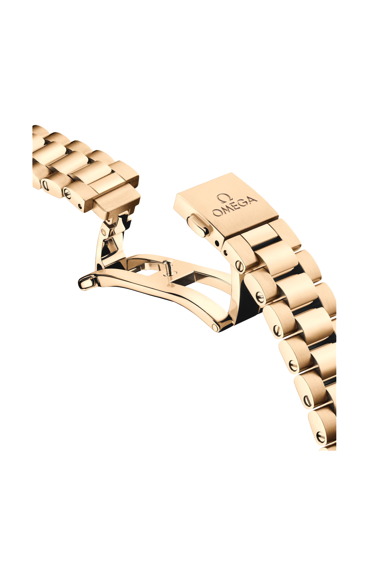 L’orologio è corredato da un bracciale integrato con maglie centrali lucide e maglie esterne spazzolate ed è animato dal calibro Omega Co-Axial Master Chronometer 8801, certificato dall’Istituto Federale Svizzero di Metrologia (METAS) secondo i più elevati standard stabiliti dal settore orologiero.