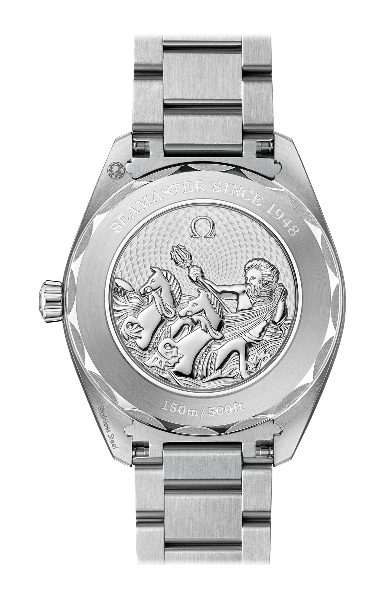 Girando l'orologio si scopre un logo commemorativo Seamaster stampato, che raffigura Poseidone con il suo tridente e due cavallucci marini: il logo Omega originale del 1956 si unisce a quello attuale. Dietro il fondello si cela il calibro Omega Co-Axial Master Chronometer 8900, certificato dall’Istituto Federale Svizzero di Metrologia (METAS) secondo i più elevati standard del settore.