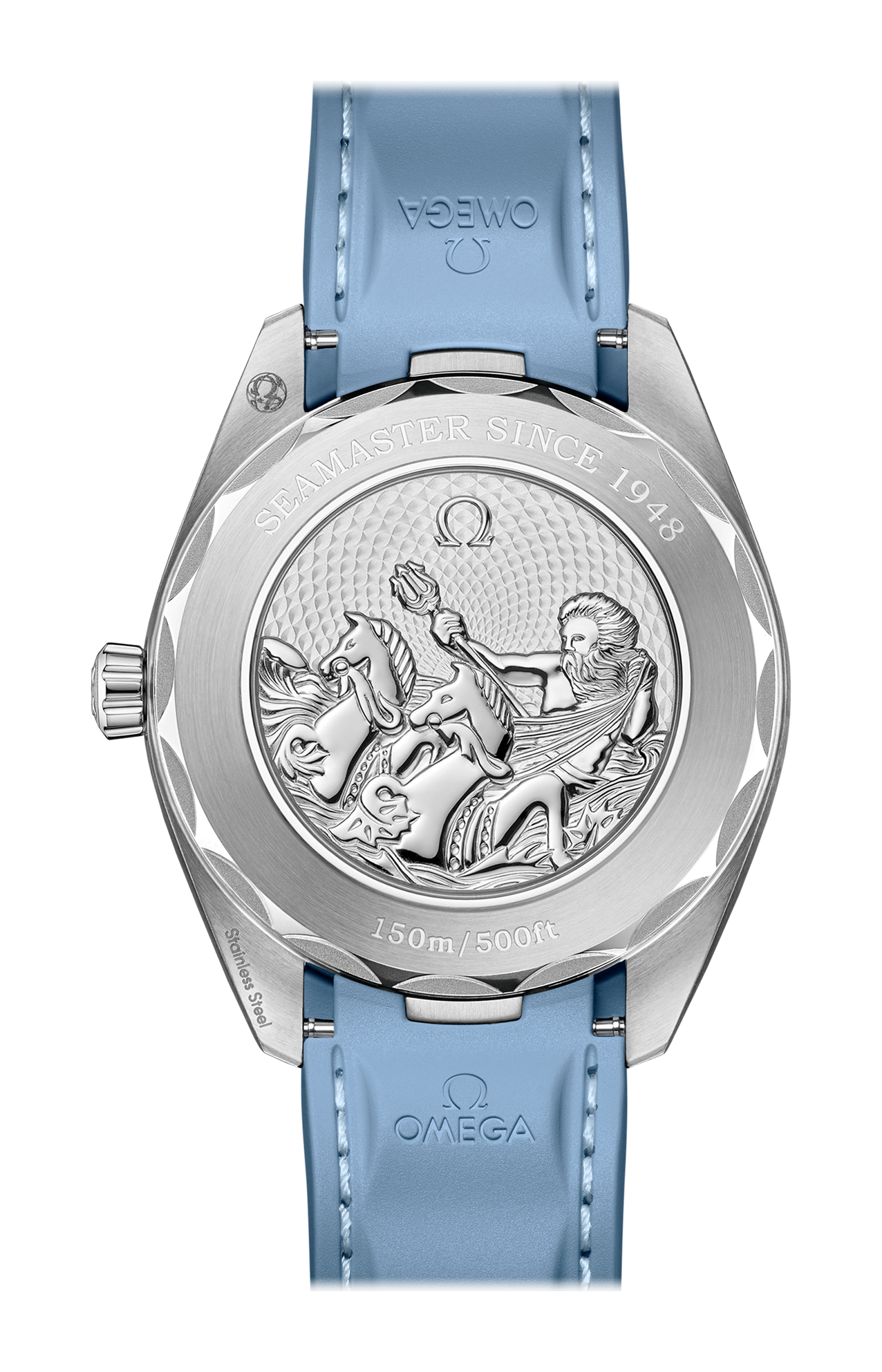Girando l'orologio si scopre un logo commemorativo Seamaster stampato, che raffigura Poseidone con il suo tridente e due cavallucci marini: il logo Omega originale del 1956 si unisce a quello attuale. Dietro il fondello si cela il calibro Omega Co-Axial Master Chronometer 8900, certificato dall’Istituto Federale Svizzero di Metrologia (METAS) secondo i più elevati standard del settore.