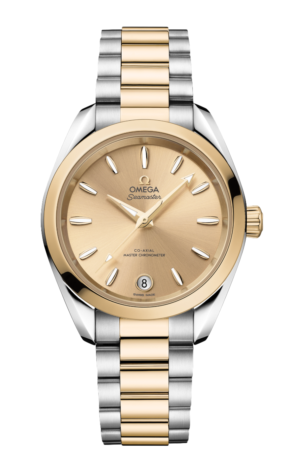 Questo modello da 34 mm in acciaio inossidabile e oro Moonshine™ 18K lucido presenta una corona conica e un fondello piatto in vetro zaffiro con bordo ondulato. Il quadrante spazzolato a raggi di sole, laccato e sottoposto a trattamento in PVD oro Moonshine™ presenta un datario a finestrella circolare a ore 6 incorniciato in oro Moonshine™ 18K. Omega ha scelto l’oro Moonshine™ 18K anche per le lancette sfaccettate e gli indici delle ore, dalla forma distintiva ispirata allo scafo di una barca a vela e riempiti di Super-Luminova bianca.