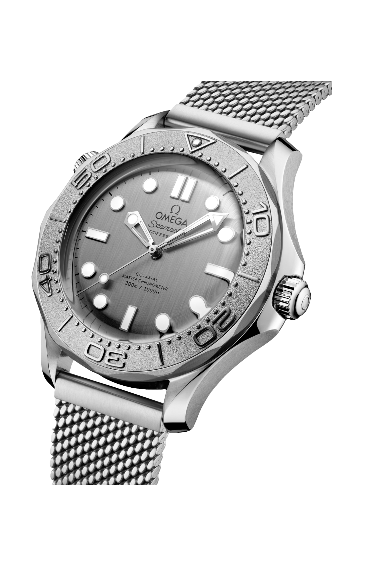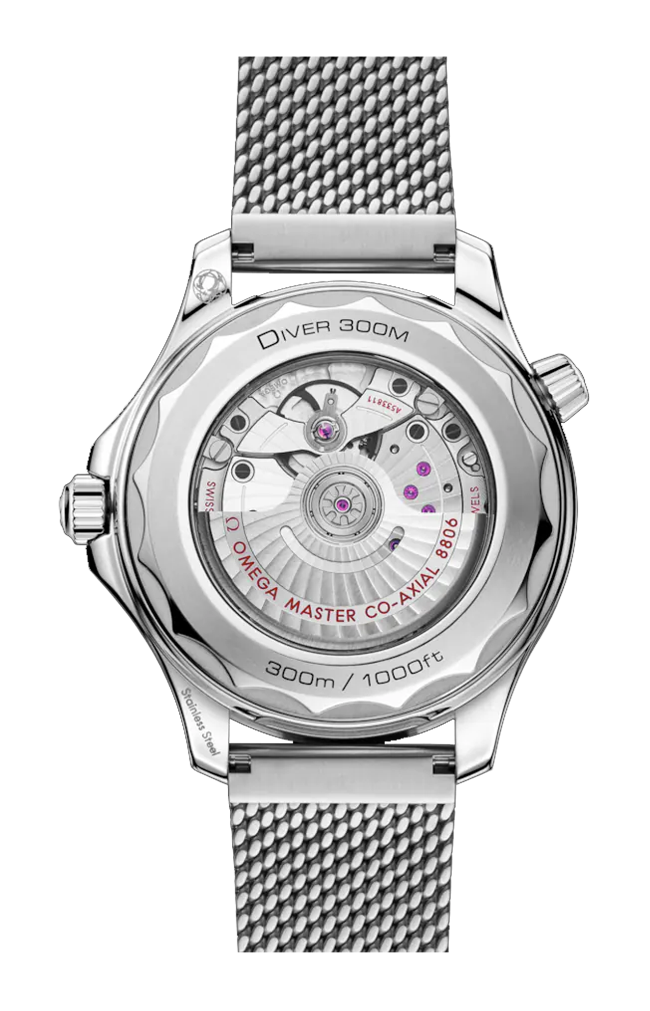 Corredato da un bracciale a maglia milanese spazzolato con fibbia, l'orologio è animato dal calibro Omega Co-Axial Master Chronometer 8806, visibile attraverso il fondello in vetro zaffiro.