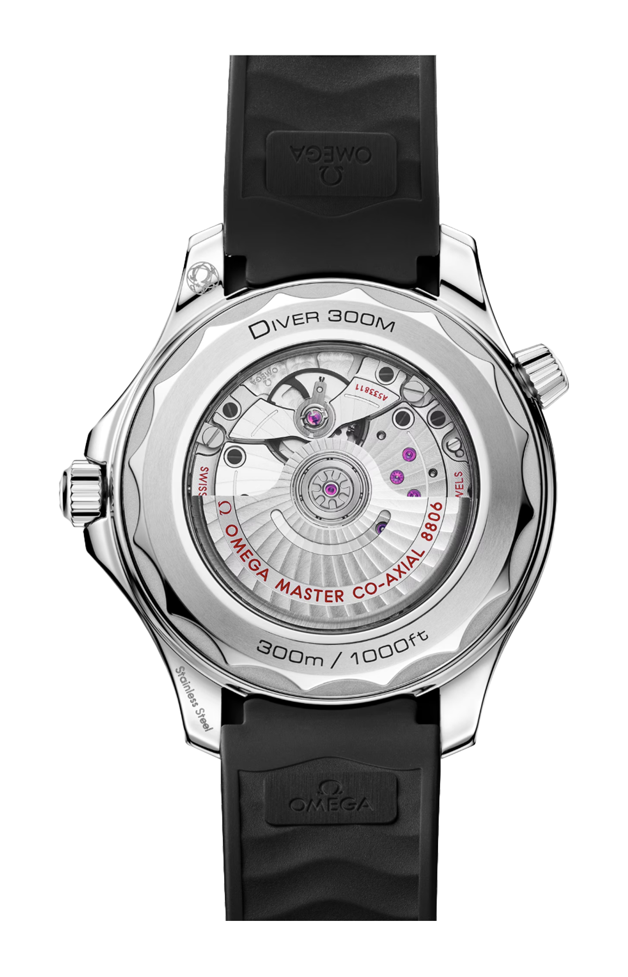 Corredato da un cinturino integrato in caucciù nero con fibbia déployante, l’orologio è animato dal calibro OMEGA Co-Axial Master Chronometer 8806, visibile attraverso il fondello in vetro zaffiro.