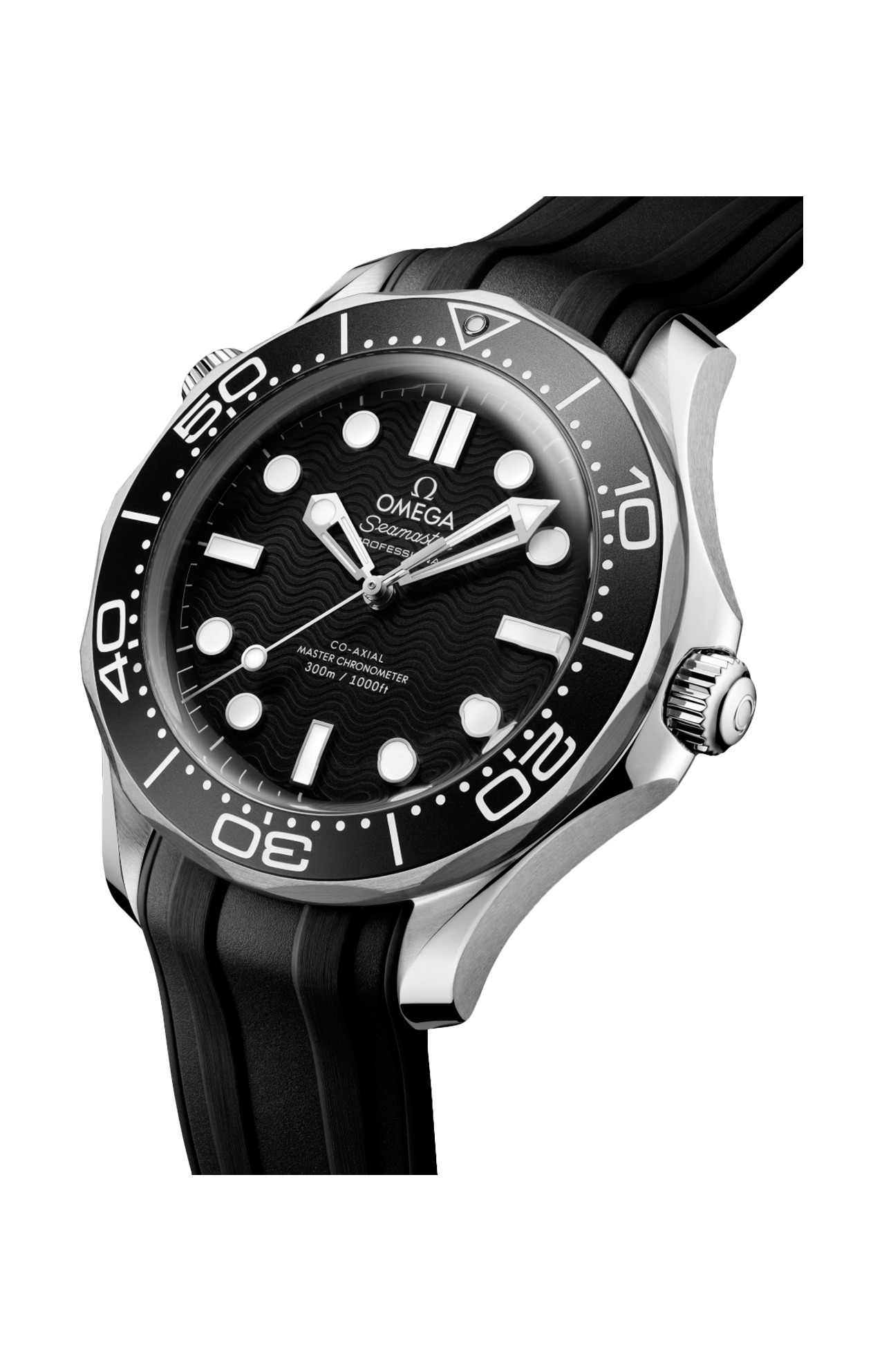 L’alluminio nero è impiegato anche per la creazione del quadrante con l’iconico motivo a onde del Diver inciso al laser. Le lancette e gli indici scheletrati sono rodiati e riempiti di Super-Luminova bianca, mentre gli altri elementi, incluso il logo OMEGA, sono di colore bianco.