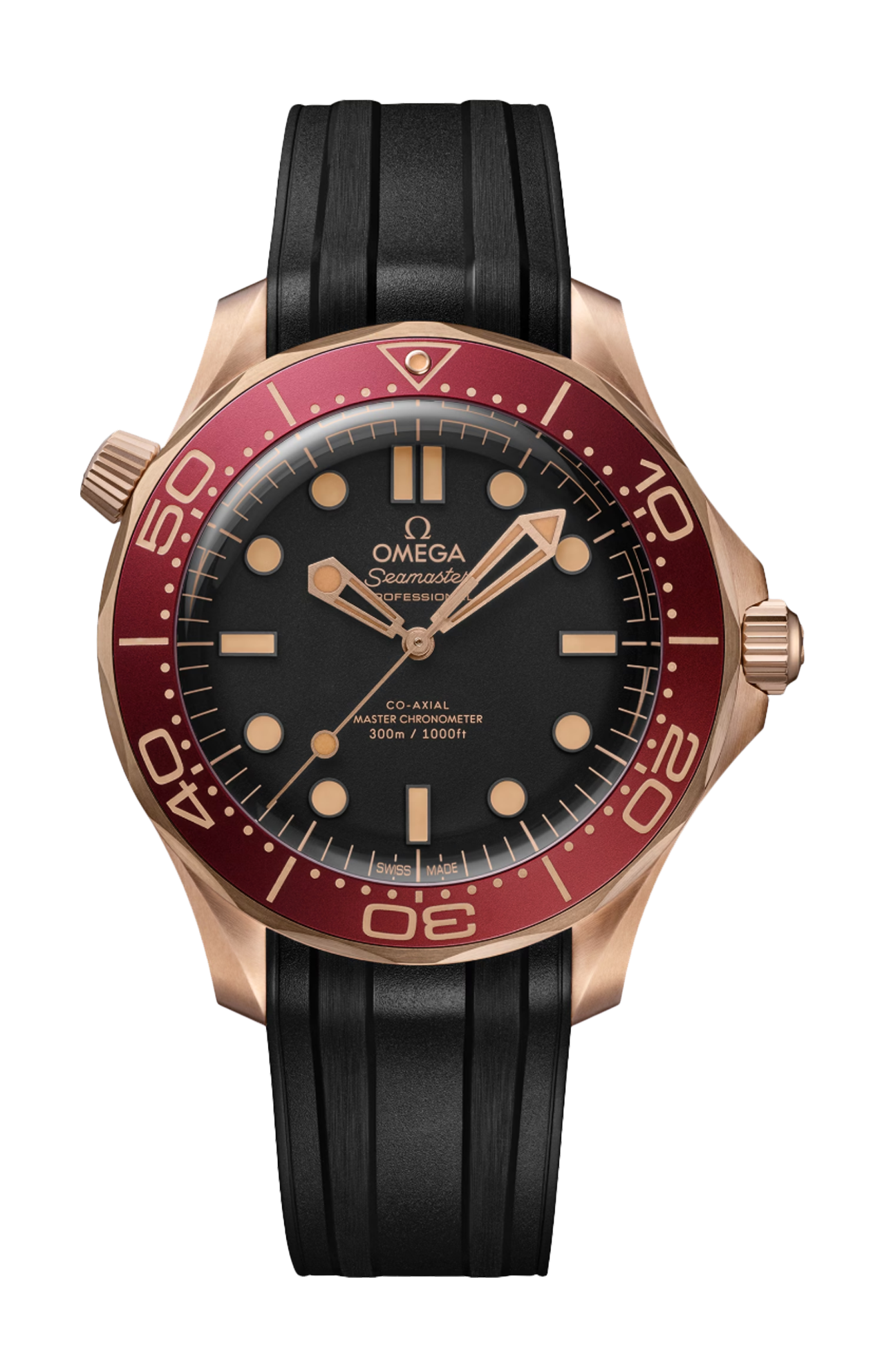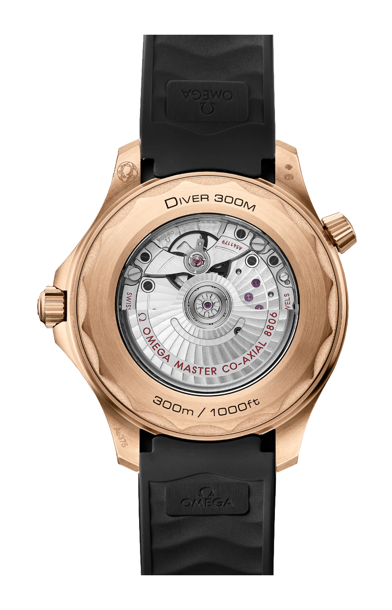 Corredato da un cinturino integrato in caucciù nero con fibbia, l’orologio è animato dal calibro OMEGA Co-Axial Master Chronometer 8806, visibile attraverso il fondello in vetro zaffiro.