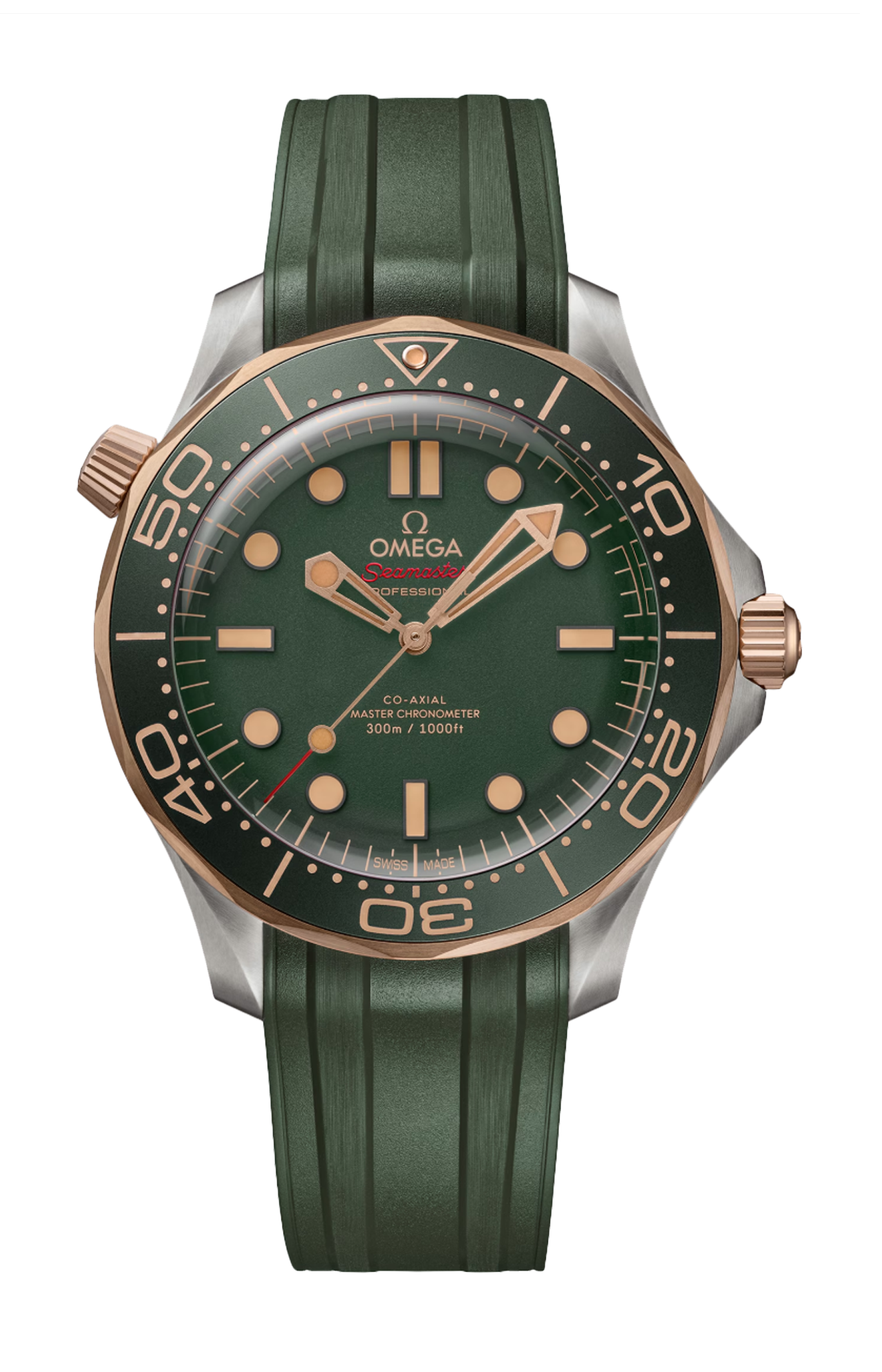 Questo modello da 42 mm è realizzato in titanio grado 2 e nell’esclusivo Bronze Gold di OMEGA. Include una lunetta con anello in alluminio anodizzato verde e scala graduata vintage in Super-Luminova.