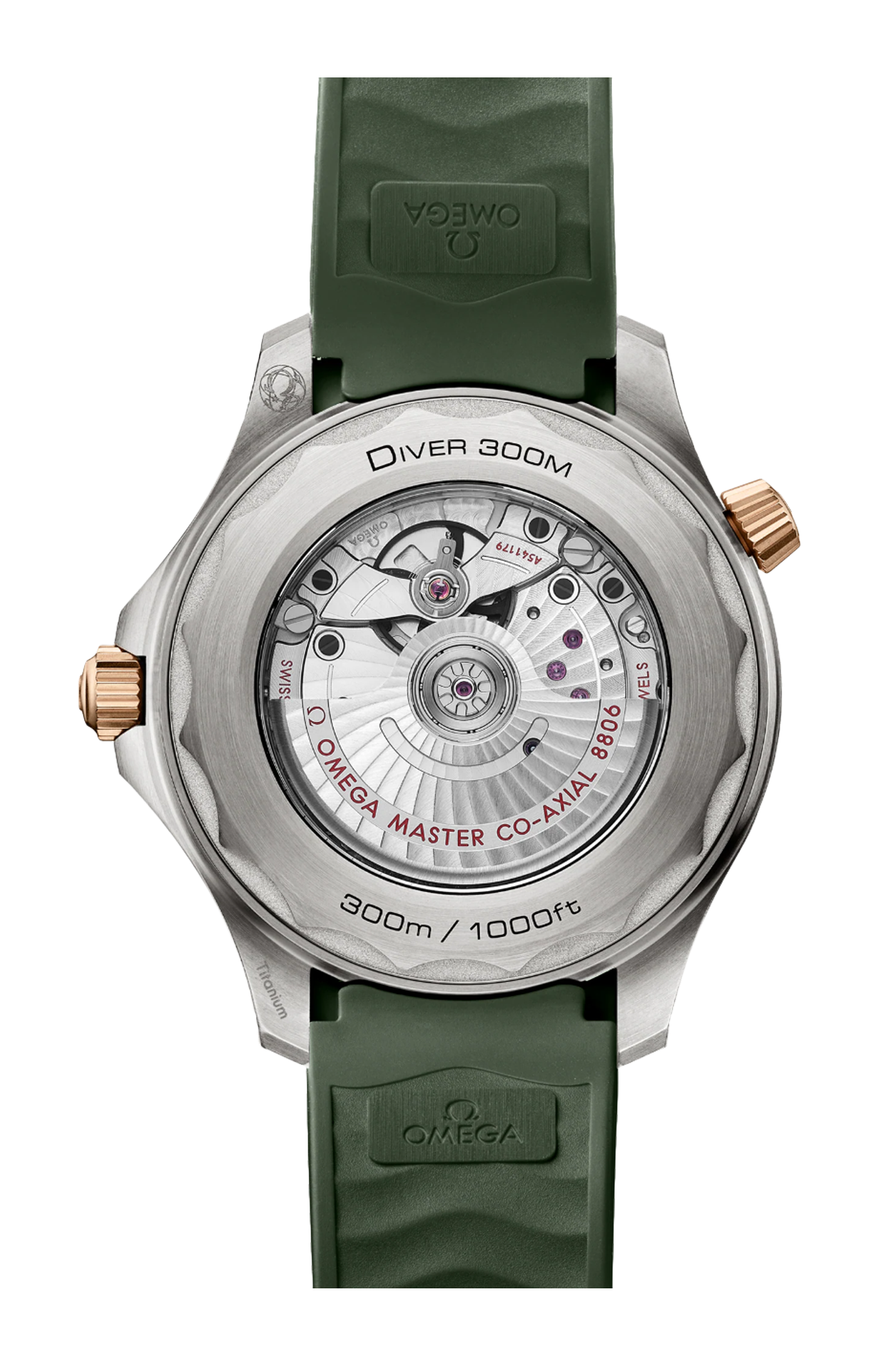 Corredato da un cinturino integrato in caucciù verde con fibbia déployante, l’orologio è animato dal calibro OMEGA Co-Axial Master Chronometer 8806, visibile attraverso il fondello in vetro zaffiro.
