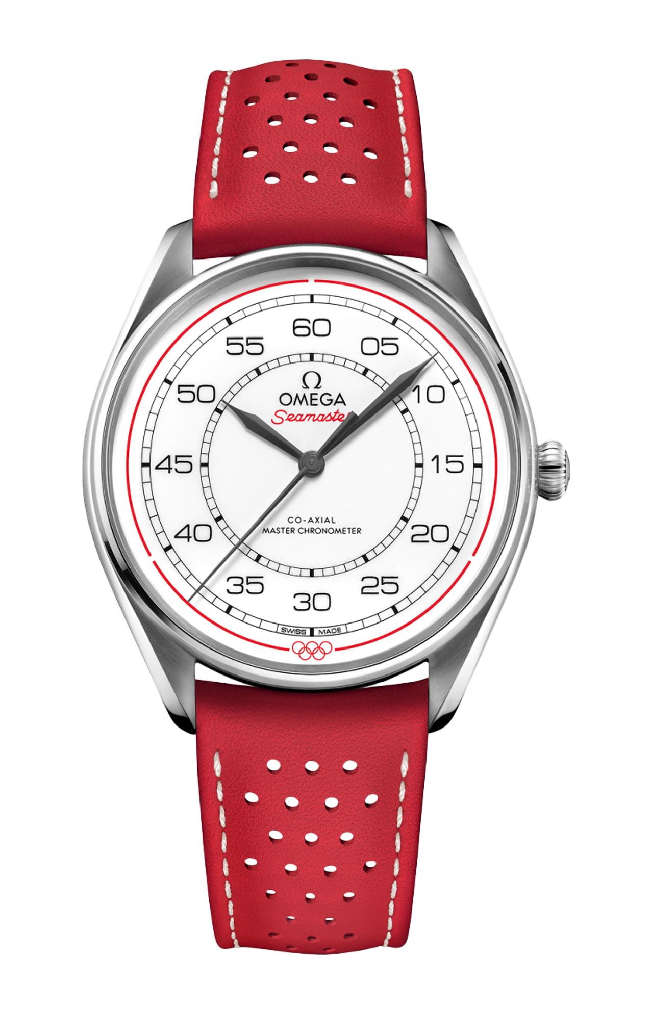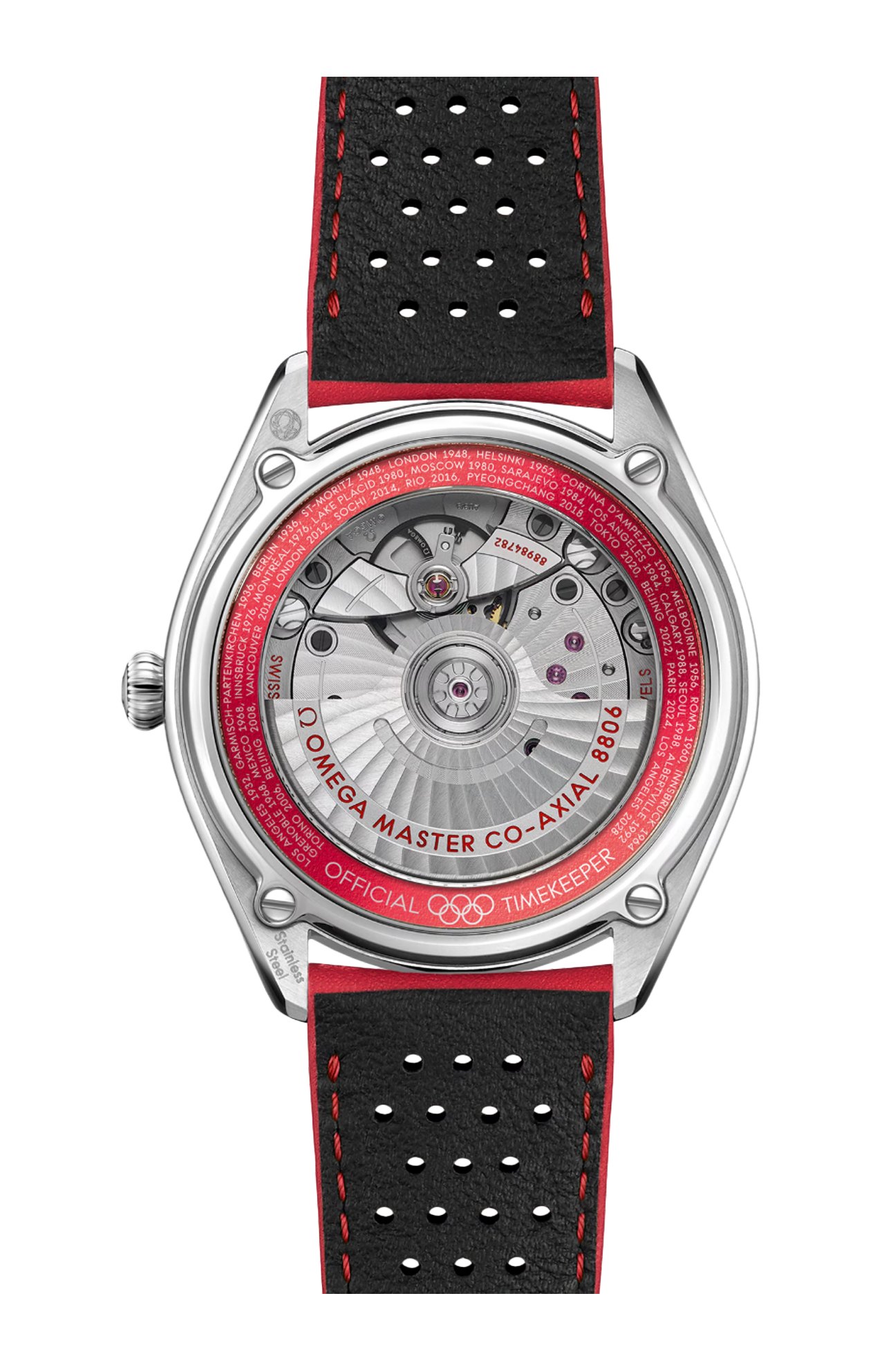 Il fondello presenta un anello in alluminio rosso anodizzato con tutte le città e le date in cui si sono svolti i Giochi Olimpici cronometati da Omega: da Los Angeles 1932 a Los Angeles 2028.