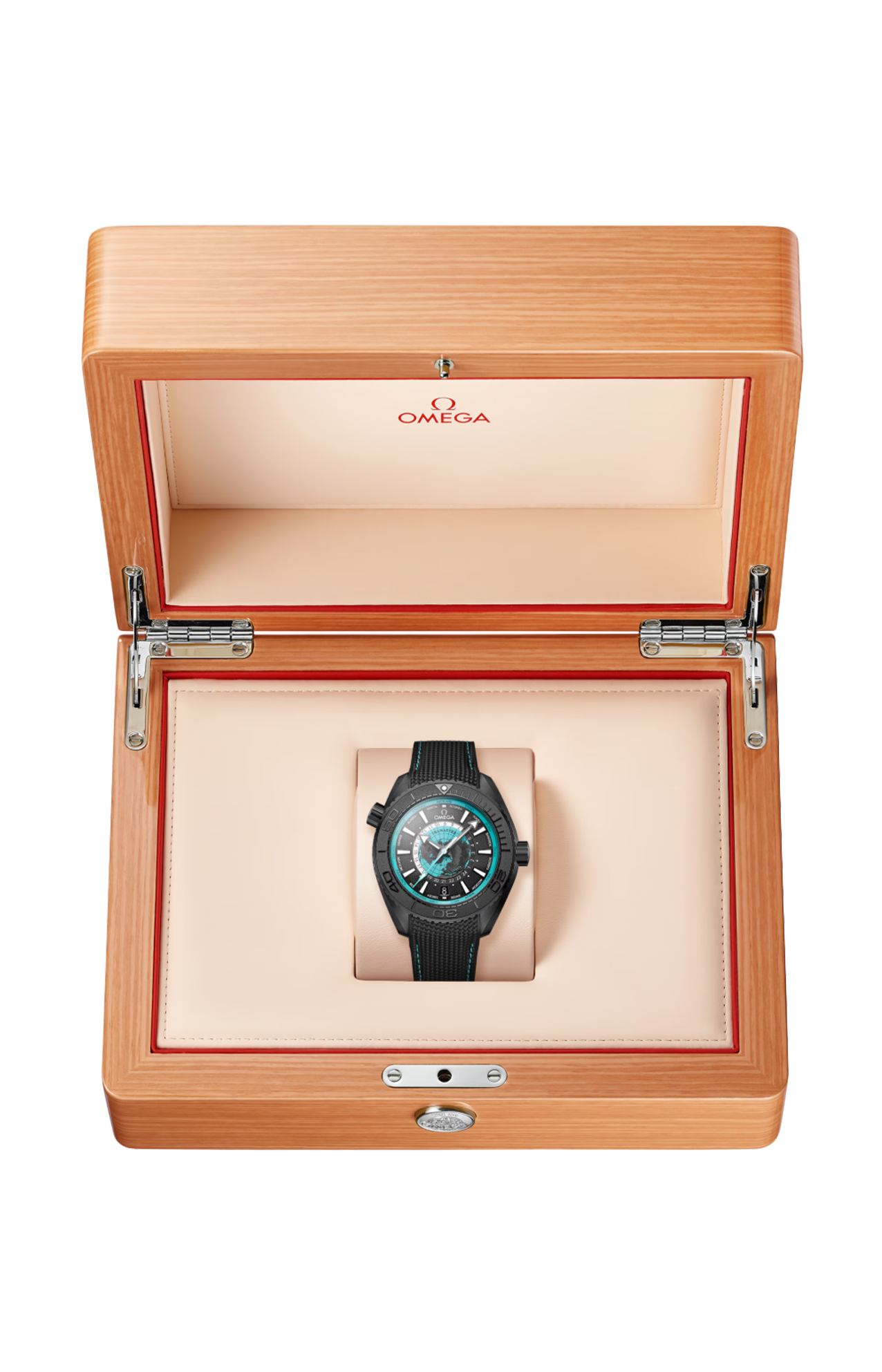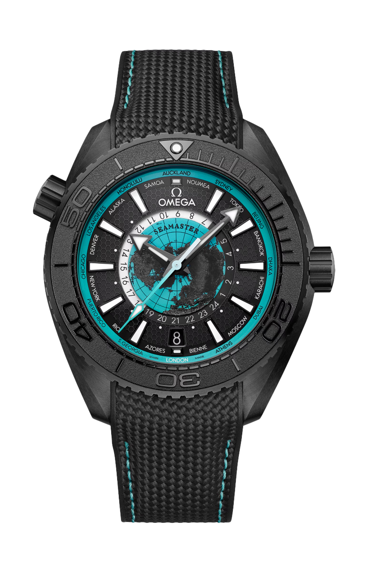 Al centro del quadrante, Omega ha riprodotto una rappresentazione della Terra osservata dal Polo Nord, realizzata su una superficie in titanio grado 5 mediante ablazione al laser e smaltatura turchese. A incorniciare la carta topografica, un’indicazione delle 24 ore, suddivisa in sezioni giorno e notte visibili attraverso il vetro esalite. Il quadrante riporta in modo circolare le principali destinazioni mondiali, tra cui Bienne, sede di Omega, e si caratterizza per una sezione esterna con rivestimento DLC nero e motivo a nido d’ape lucido ottenuto mediante ablazione al laser. Vanta indici diamantati e spazzolati e lancette con rivestimento in PVD grigio entrambi riempiti di Super-Luminova bianca, e un anello esterno smaltato turchese.