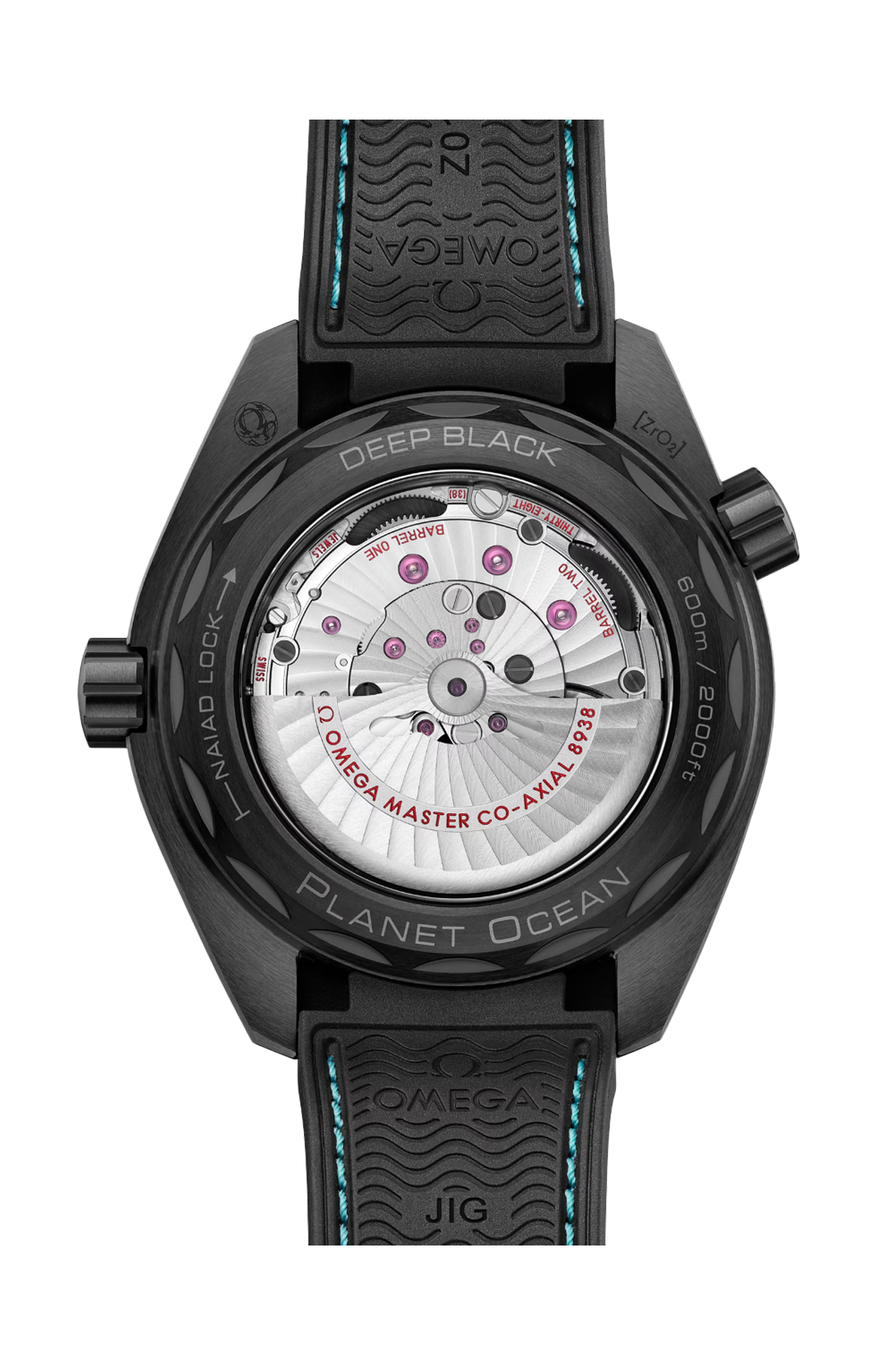 Questo orologio Worldtimer è corredato da un cinturino integrato in caucciù strutturato nero con impunture turchesi e fibbia déployante in ceramica e titanio ceramizzato. Il modello è animato dal calibro Omega Co-Axial Master Chronometer 8938, visibile attraverso il fondello in vetro zaffiro.