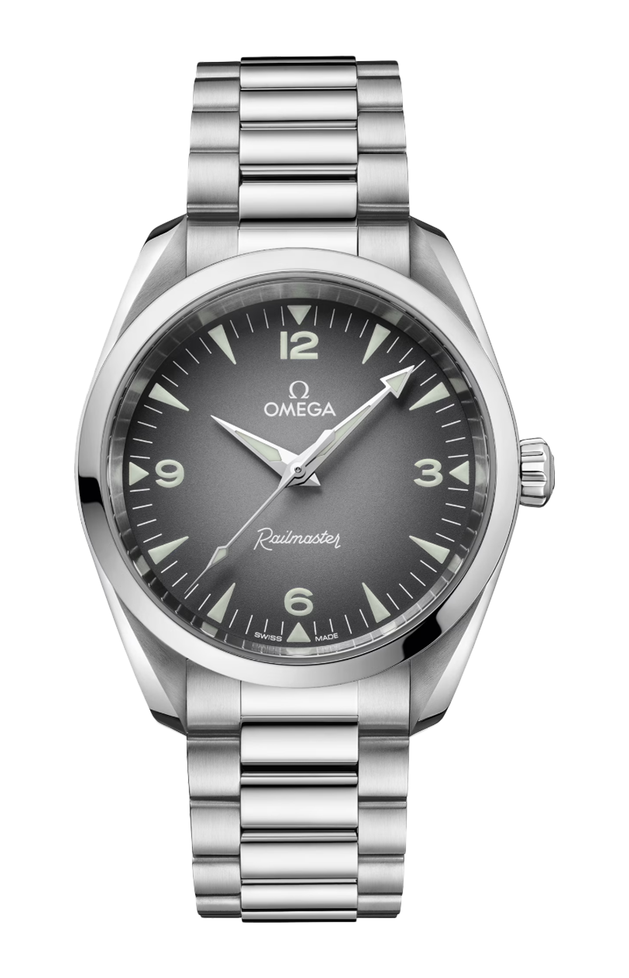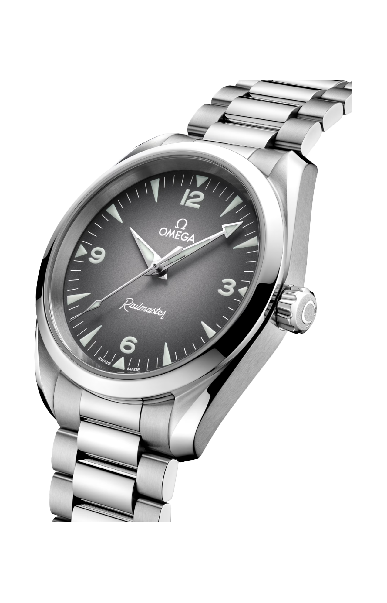 La cassa simmetrica da 38 mm è lucida e spazzolata, e corredata da un bracciale integrato con regolazione comfort e maglie lucide e spazzolate. Nel rispetto dei codici di design del Railmaster originale, il quadrante di facile lettura è color grigio con sfumature nere e presenta numeri grandi e indici delle ore in super-luminova bianca.