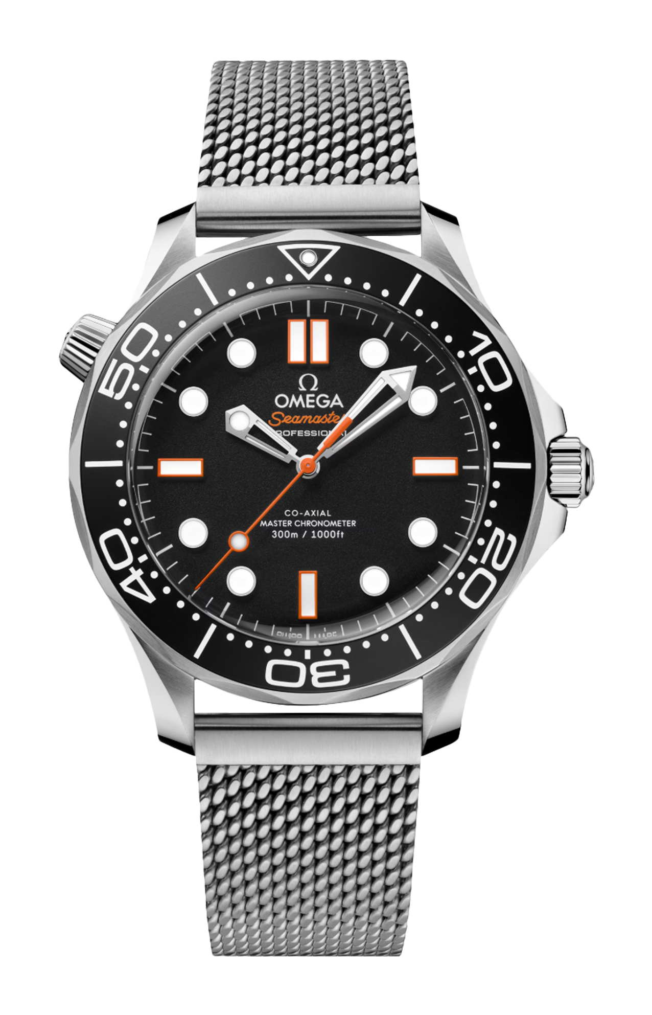 Il quadrante, anch’esso in alluminio anodizzato nero, vanta lancette rodiate scheletrate e indici riempiti di Super-Luminova bianca. Il colore arancione caratterizza la lancetta centrale dei secondi, gli indici dei quarti d’ora e la dicitura “Seamaster”, mentre il logo Omega applicato è di colore bianco.
