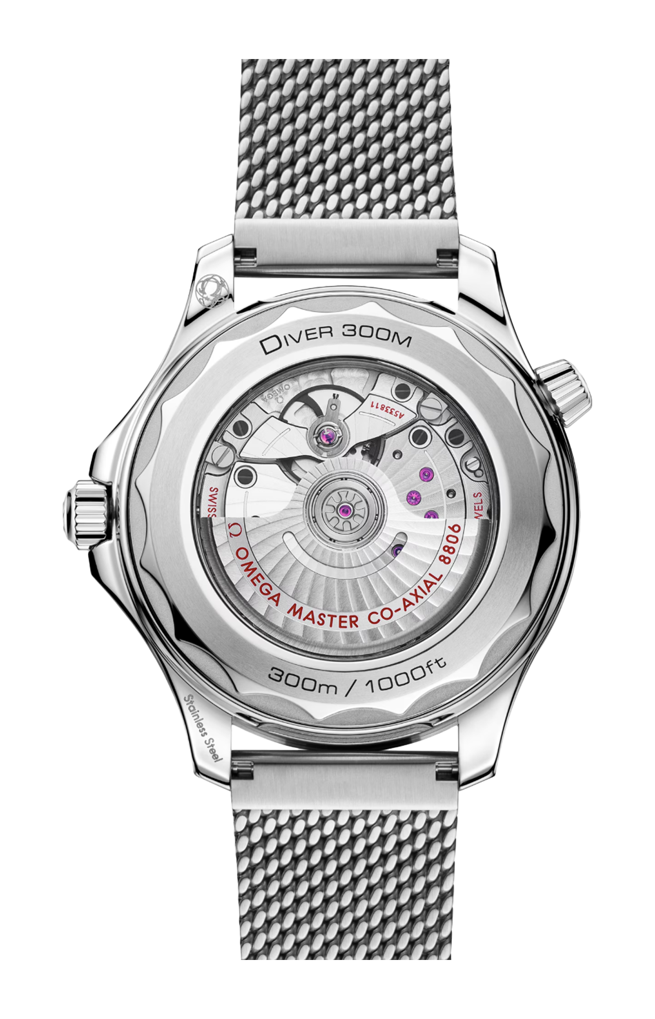 L’orologio è corredato da un bracciale a maglia spazzolato con fibbia ed è animato dal calibro Omega Co-Axial Master Chronometer 8806, visibile attraverso il fondello in vetro zaffiro.
