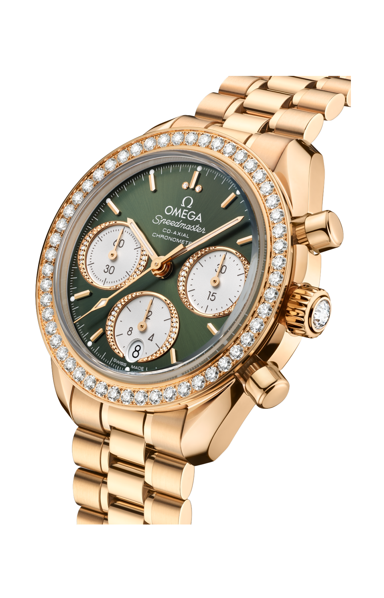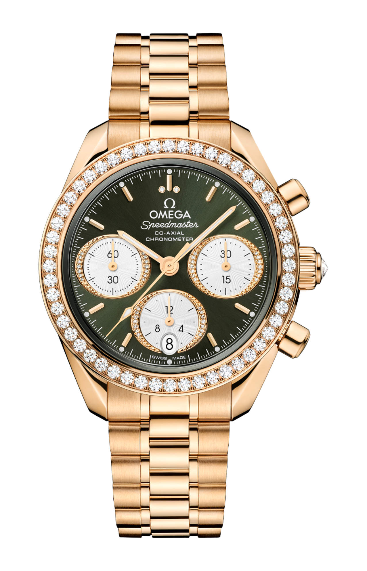 La collezione Speedmaster 38 mm è stata realizzata puntando su semplicità, dimensioni e colore, pur mantenendo il look e la tradizione distintivi del più celebre cronografo di Omega. Questo modello, dotato di cassa in oro Moonshine™ 18K interamente lucido, presenta una lunetta con 52 diamanti e una corona lucida con un diamante.