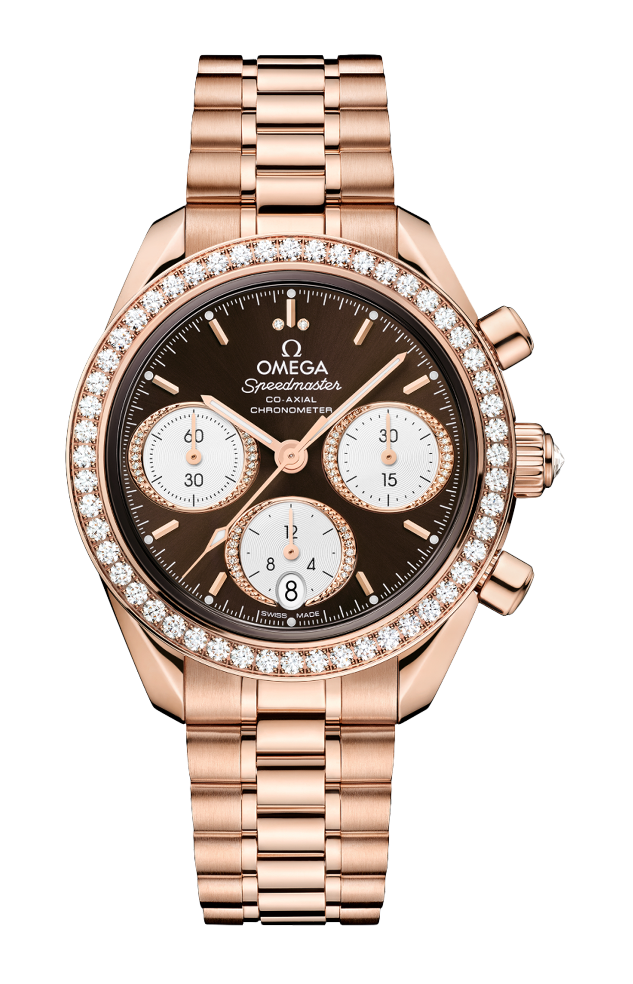 La collezione Speedmaster 38 mm è stata realizzata puntando su semplicità, dimensioni e colore, pur mantenendo il look e la tradizione distintivi del più celebre cronografo di Omega. Questo modello, dotato di cassa in oro Sedna™ 18K interamente lucido, presenta una lunetta con 52 diamanti e una corona lucida con un diamante.