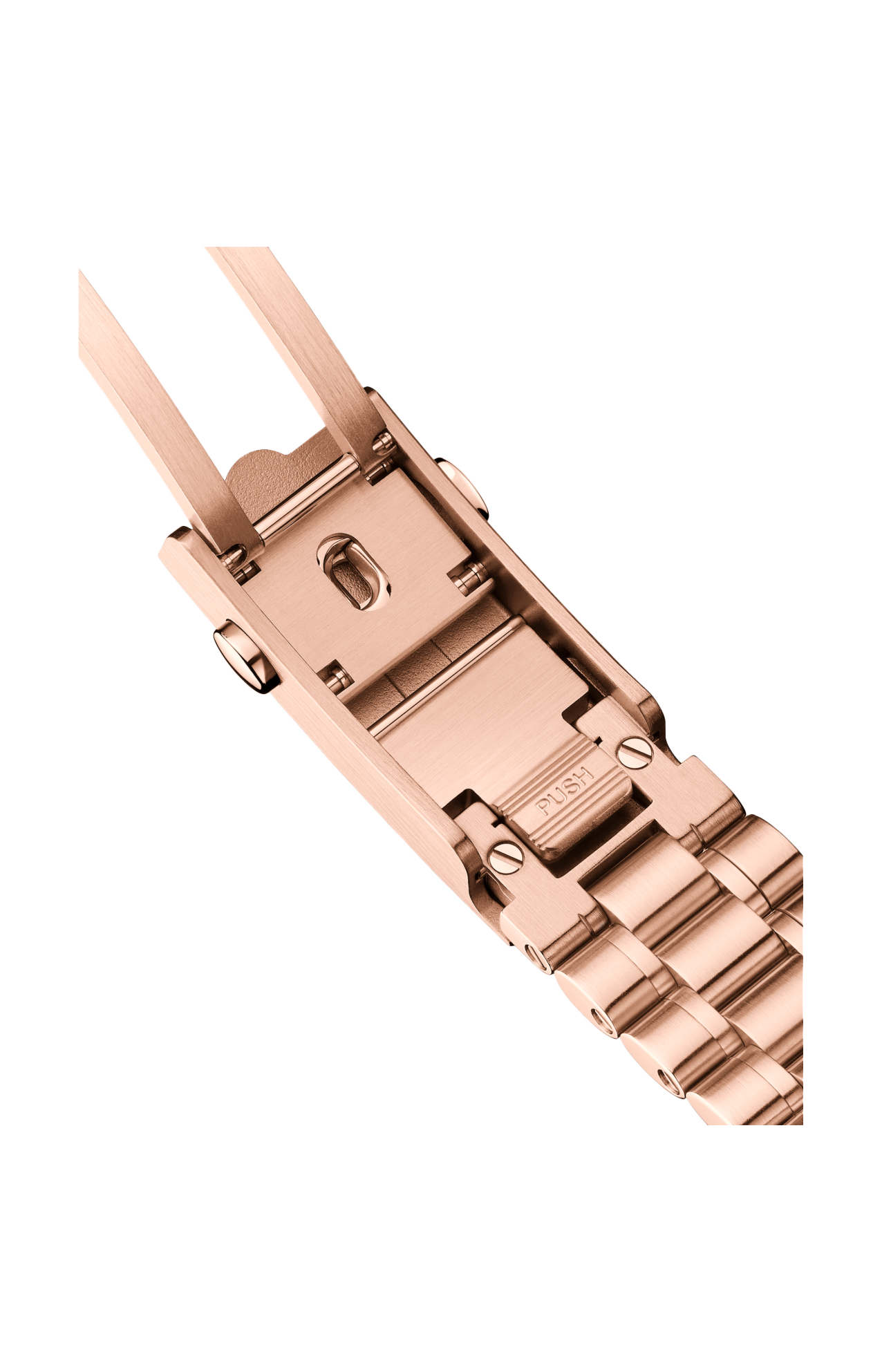 Il quadrante in PVD marrone comprende contatori ovali orizzontali con rivestimento argentato e un datario a finestrella ovale verticale a ore 6. Le lancette di ore e minuti, diamantate in oro Sedna™ 18K, sono riempite di Super-Luminova bianca che emette una luminescenza verde.