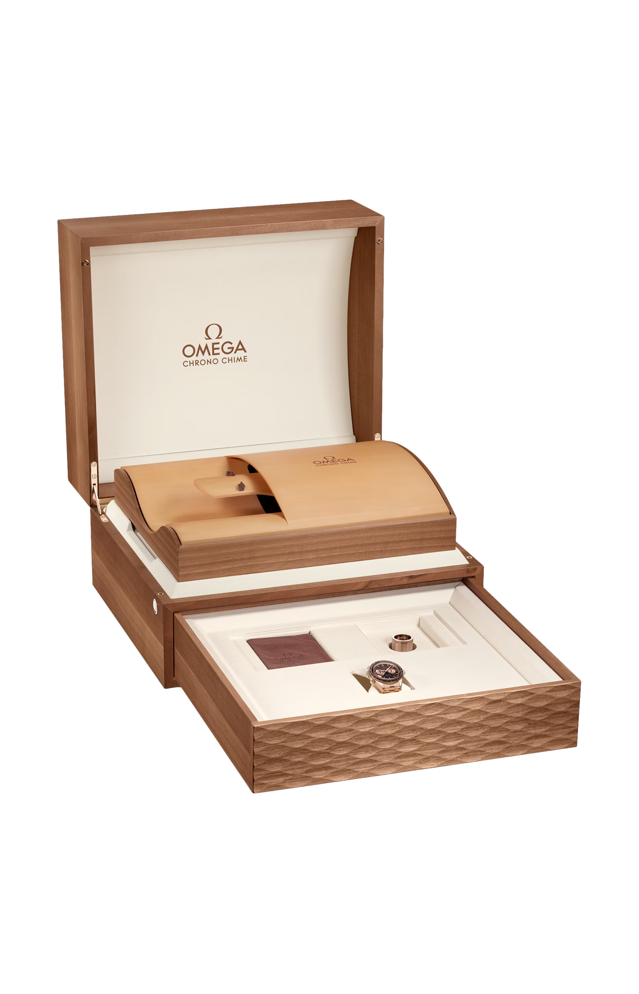 Lo speciale cofanetto di presentazione in noce presenta una placca di risonanza in abete rosso per amplificare il suono di ogni rintocco. La cassa monumentale dell’orologio è corredata da una lente di ingrandimento per osservare i dettagli dell’orologio, un libro di favole e una borsa da viaggio.