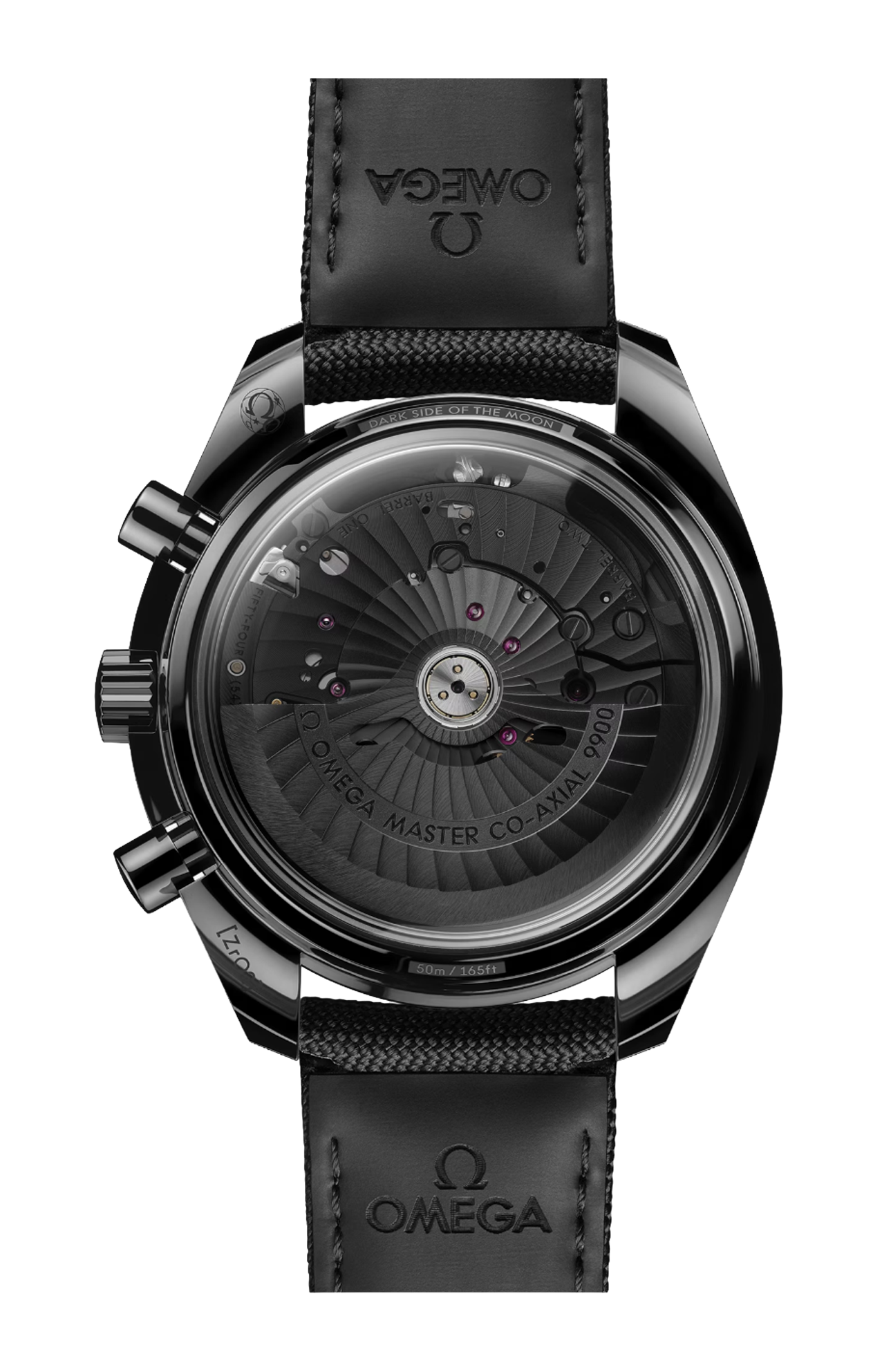 Visibile attraverso il fondello, il calibro Co-Axial Master Chronometer 9900 a carica automatica di OMEGA presenta una speciale finitura opaca brunita sul rotore, sulla platina principale e sui ponti, nonché incisioni laccate nere. L’orologio è corredato da un cinturino in nylon nero con una fibbia déployante in ceramica e componenti incernierati a molla realizzati in titanio ceramizzato.