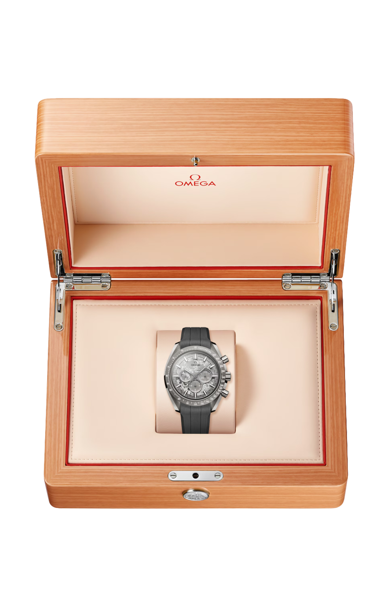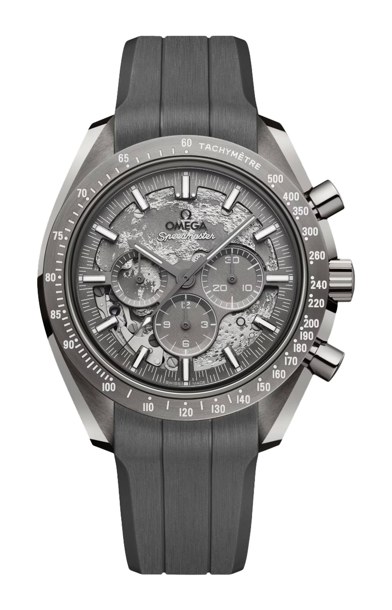 Omaggio alla tradizione di Omega nel campo delle esplorazioni spaziali, questo Speedmaster Grey Side of the Moon vanta una cassa da 44,25 mm in ceramica grigia lucida e spazzolata con trattamento al plasma. Anche la lunetta spazzolata è realizzata in ceramica grigia e presenta una scala tachimetrica incisa al laser riempita di Super-Luminova bianca.