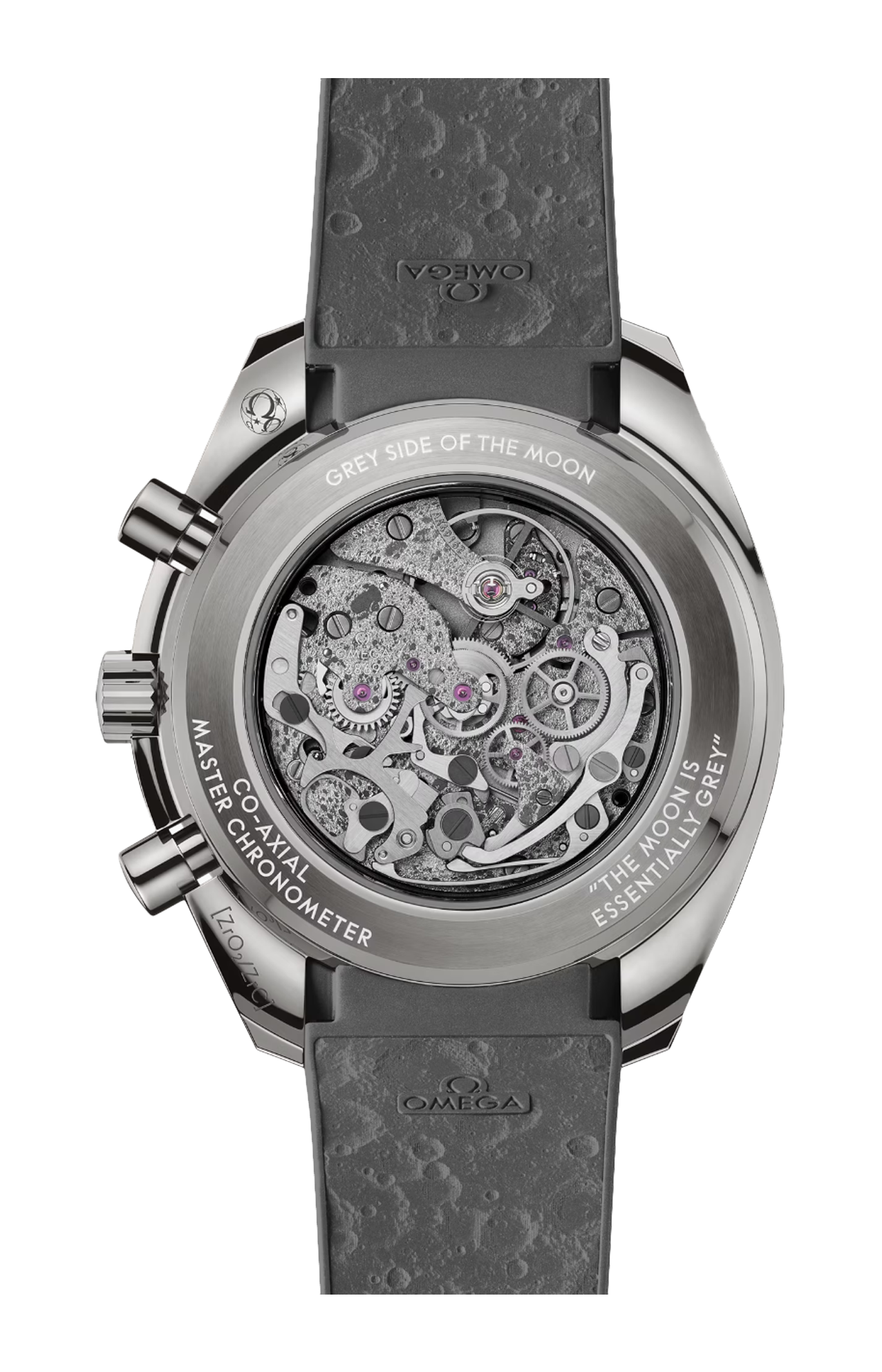 Il movimento, appositamente decorato, è il calibro Co-Axial Master Chronometer 3869 di Omega, mentre le incisioni sul fondello comprendono la citazione, The Moon is essentially grey, attribuita al pilota del modulo di comando Jim Lovell, durante la missione Apollo 8.