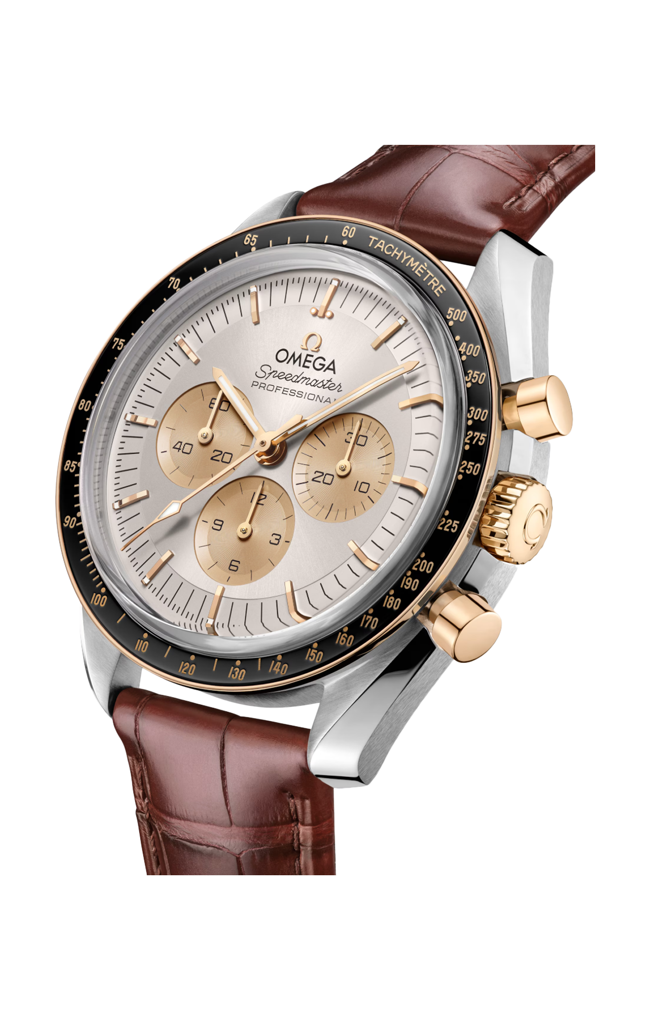 Il quadrante “Step” bianco argentato con finitura spazzolata presenta indici e logo Omega applicati, lancette in oro Moonshine™ 18K e contatori dei piccoli secondi, dei 30 minuti e delle 12 ore in oro Moonshine™ 18K con trattamento galvanico.