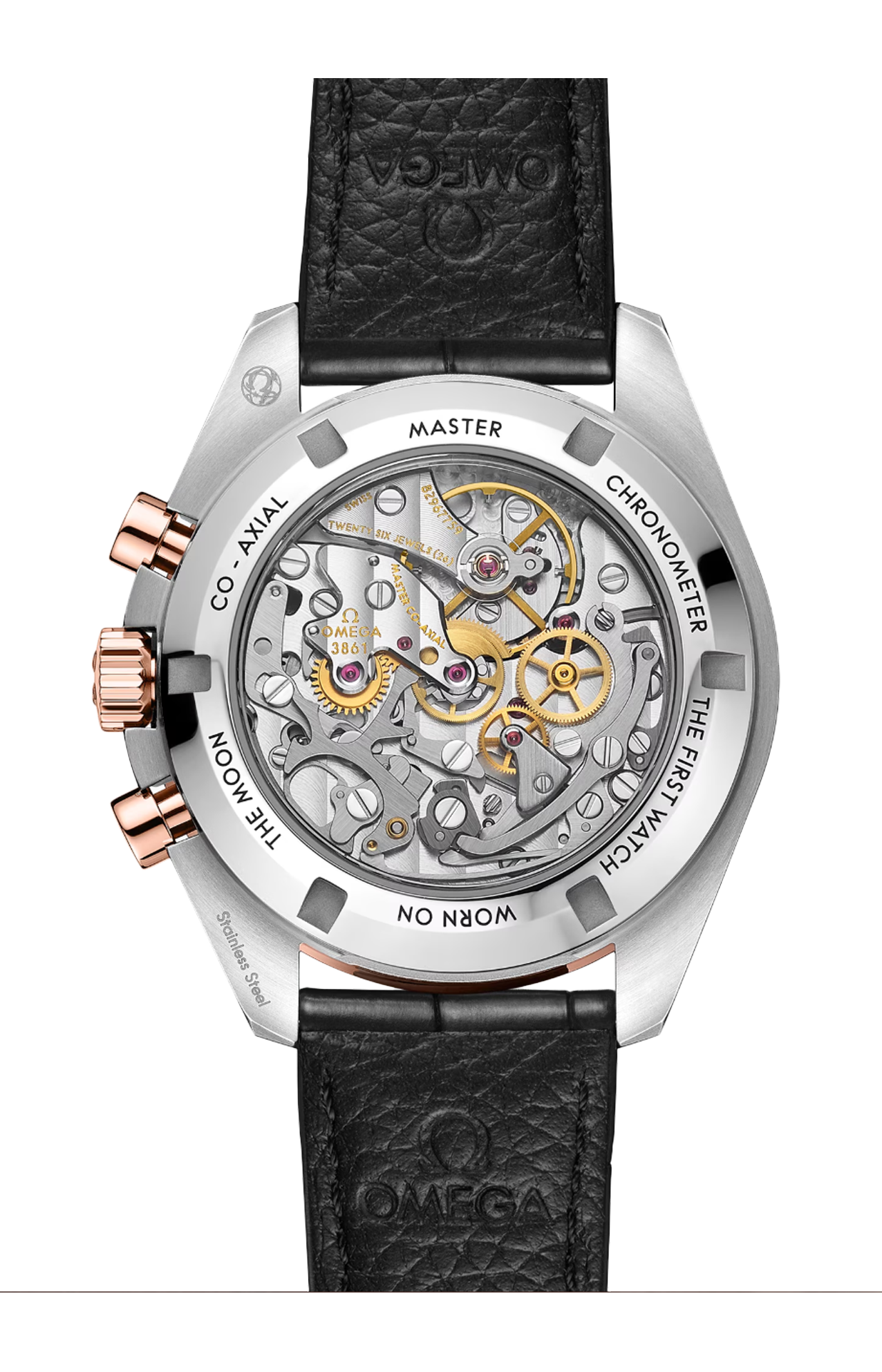 Questo modello bicolore da 42 mm in acciaio inossidabile e oro Sedna™ 18K presenta quadrante e fondello in vetro zaffiro. Ispirato alla quarta generazione di Speedmaster indossata sulla Luna, sfoggia una cassa asimmetrica con l'anello della lunetta in ceramica nera e il celebre “Dot over 90” in Ceragold™ Omega sulla scala tachimetrica.