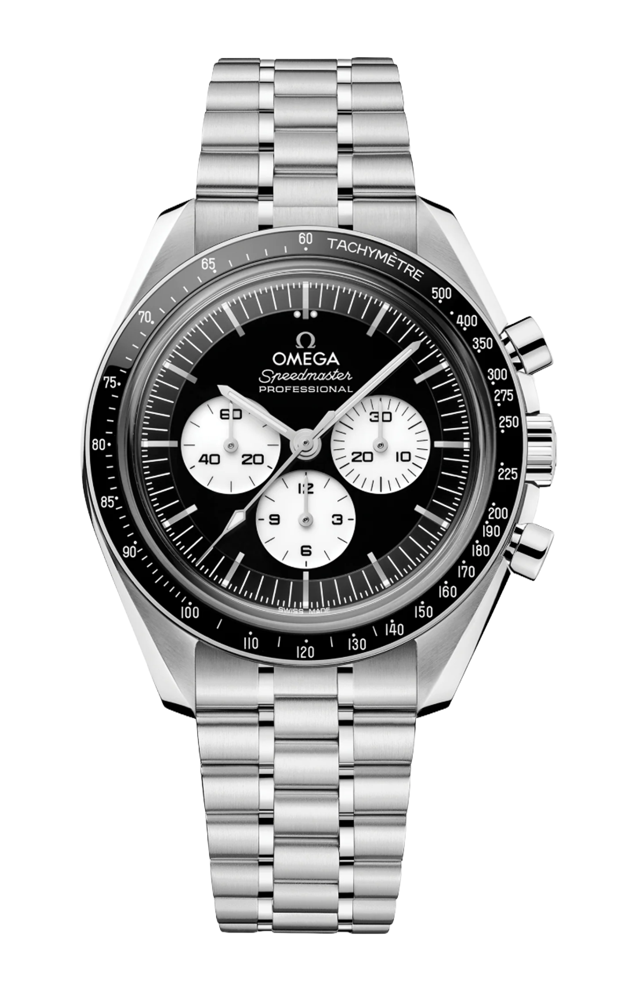 Questo modello da 42 mm si distingue per il vetro zaffiro su quadrante e fondello, ed è corredato da un bracciale in acciaio inossidabile lucido e spazzolato. Il design trae ispirazione dalla quarta generazione di Speedmaster indossati sulla Luna. Il quadrante “step” nero verniciato e laccato con doppia platina è completato da contatori bianchi laccati e verniciati, disposti in cornici rodiate. Tra i dettagli spiccano il logo OMEGA, gli indici, le lancette in stile Moonwatch e il celebre “Dot over 90” sulla lunetta in ceramica nera.