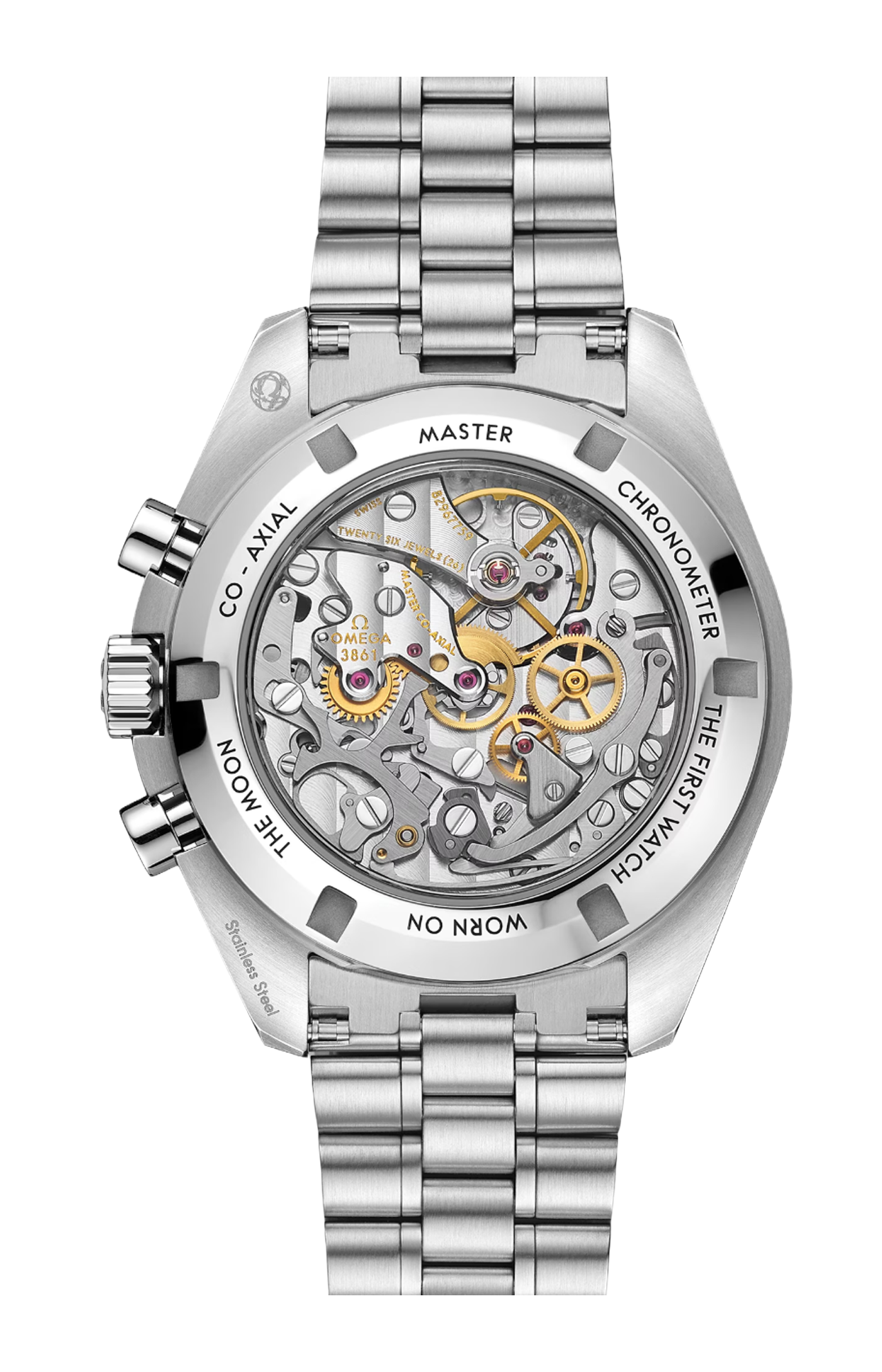 L'orologio è animato dal calibro OMEGA Co-Axial Master Chronometer 3861, che alimenta il contatore dei piccoli secondi, i contatori dei 30 minuti e delle 12 ore e la lancetta cronografica centrale.