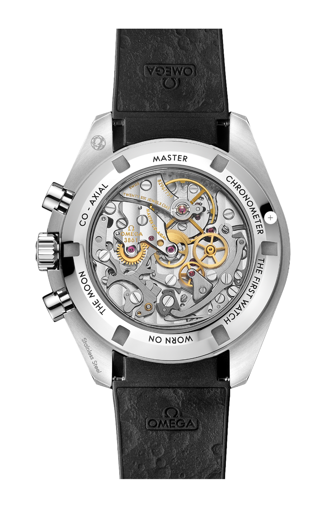 L’orologio è corredato da un cinturino in caucciù nero integrato con motivo in rilievo positivo che ricorda la superficie lunare. L’orologio è animato dal celebre calibro Omega Co-Axial Master Chronometer 3861, che alimenta il contatore dei piccoli secondi, i contatori dei 30 minuti e delle 12 ore e la lancetta cronografica centrale.