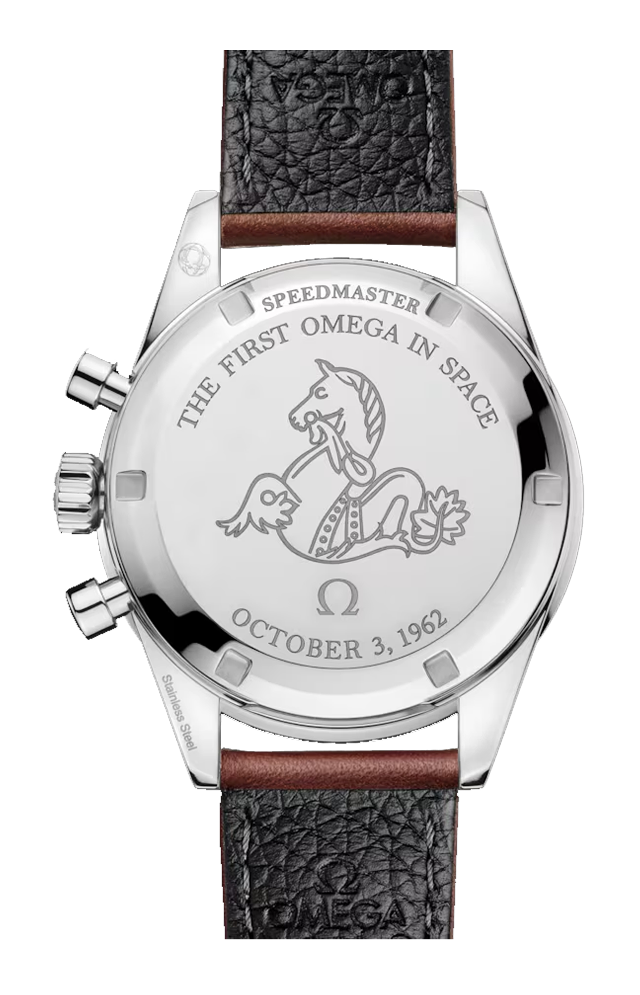 Il logo Omega vintage è applicato sul quadrante e sulla corona, mentre il fondello sfoggia il famoso medaglione con l’ippocampo e le incisioni “First Omega in Space” e “October 3, 1962”.