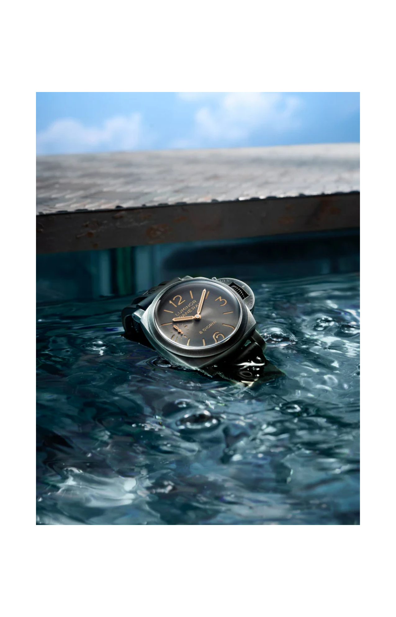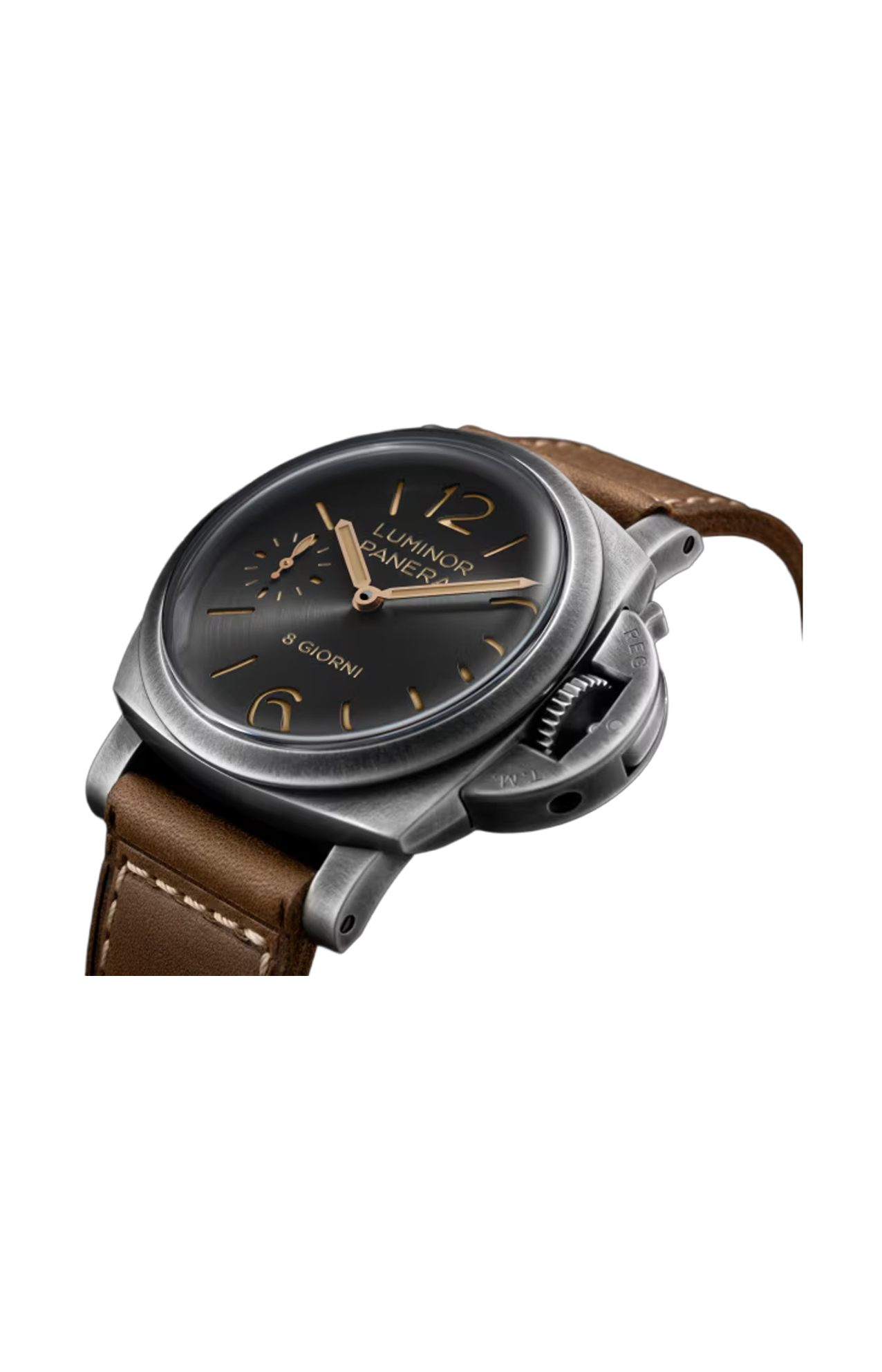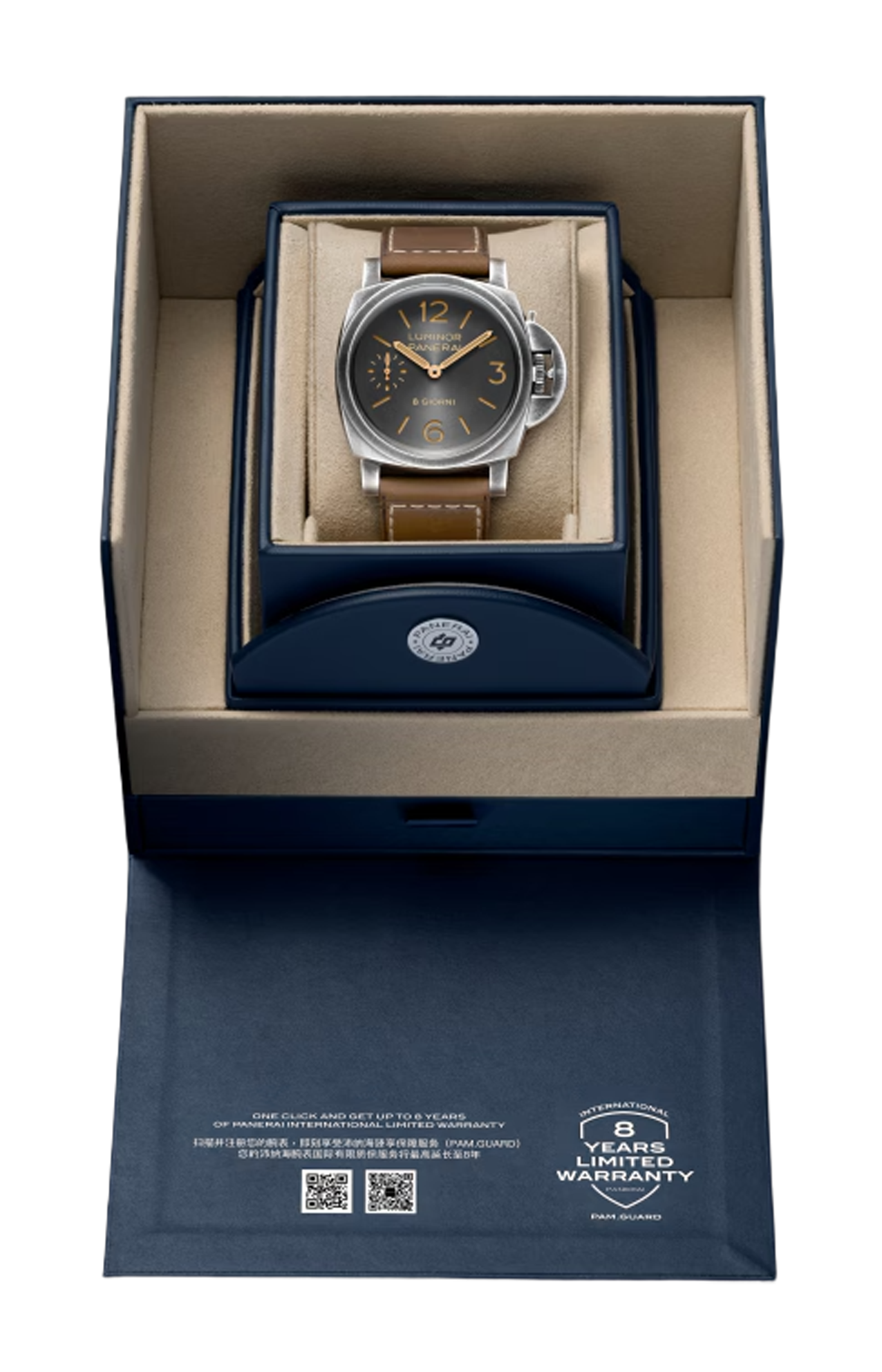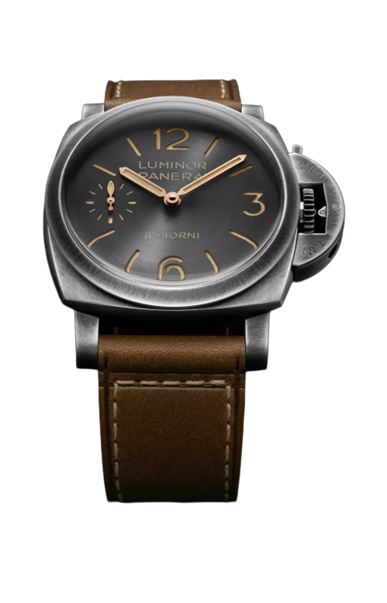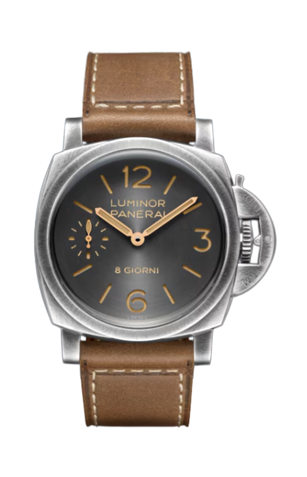 Il quadrante antracite introduce una nuova satinatura circolare, che amplifica i giochi di luce sulla superficie e dona una profondità variabile nel corso della giornata. Numeri arabi, indici e piccoli secondi a ore 9 garantiscono una leggibilità immediata, requisito fondamentale per gli strumenti subacquei originali di Panerai. L’indicazione “8 Giorni” sottolinea la tradizione del brand legata alle lunghe riserve di carica.