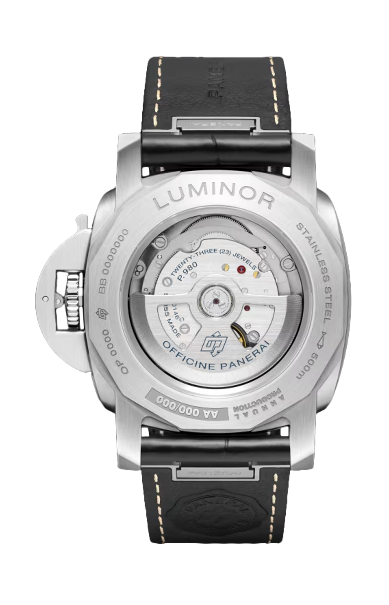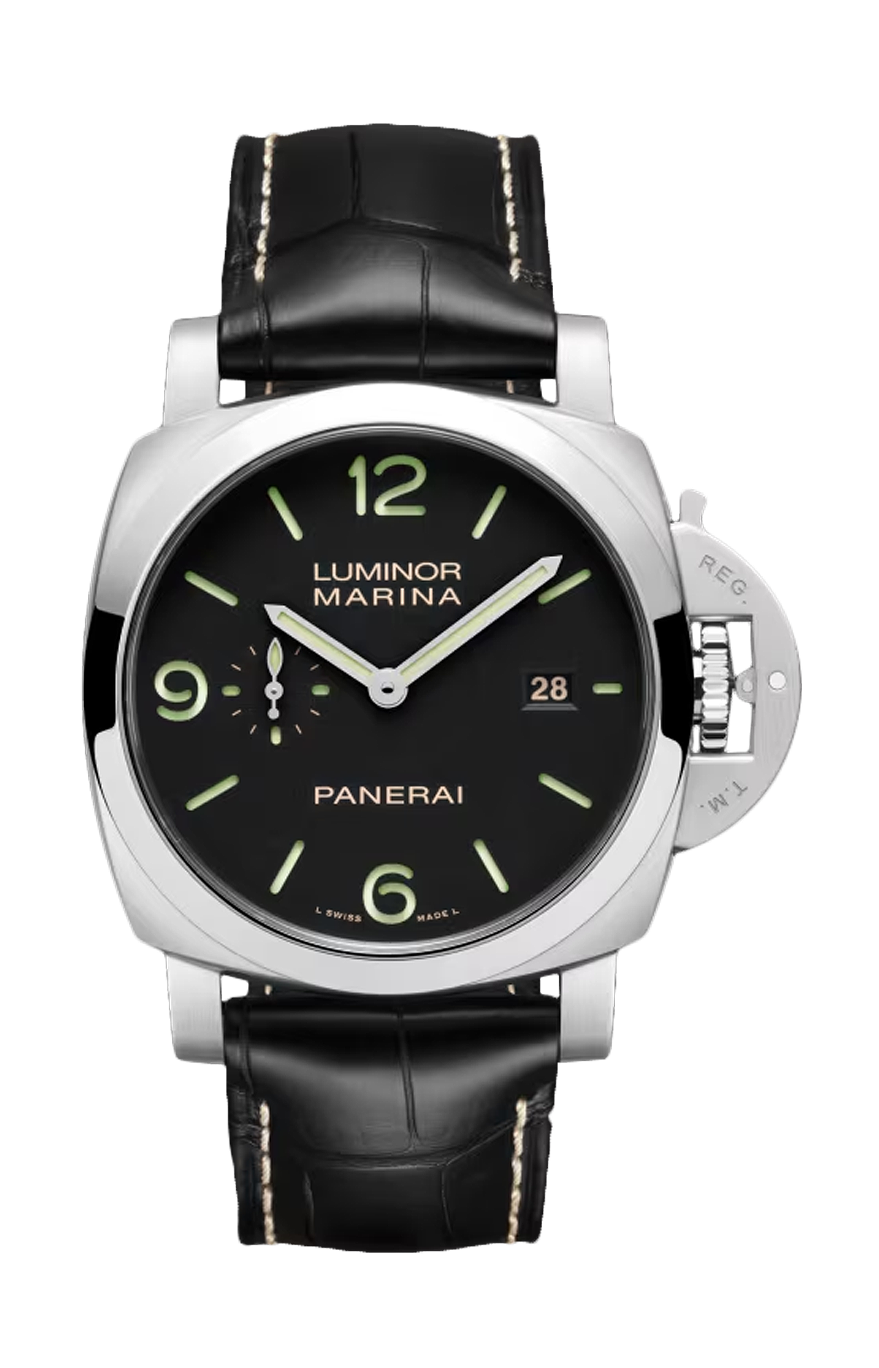 Il nuovo Luminor Marina introduce aggiornamenti chiave che ne affinano le prestazioni, la resistenza e il comfort, preservandone al contempo l'identità emblematica. La collezione presenta ora una maggiore resistenza all'acqua fino a 50 bar (~500 metri), stabilendo un nuovo standard per il Luminor Marina. L'introduzione del movimento P.980 garantisce la precisione con una riserva di carica di tre giorni, offrendo una maggiore stabilità grazie al ponte del bilanciere passante. I nuovi modelli incorporano il Super-Luminova® X2, un materiale luminescente di nuova generazione che offre una maggiore luminosità, garantendo una leggibilità ottimale in tutte le condizioni di illuminazione. Secondo cinturino caucciù nero.