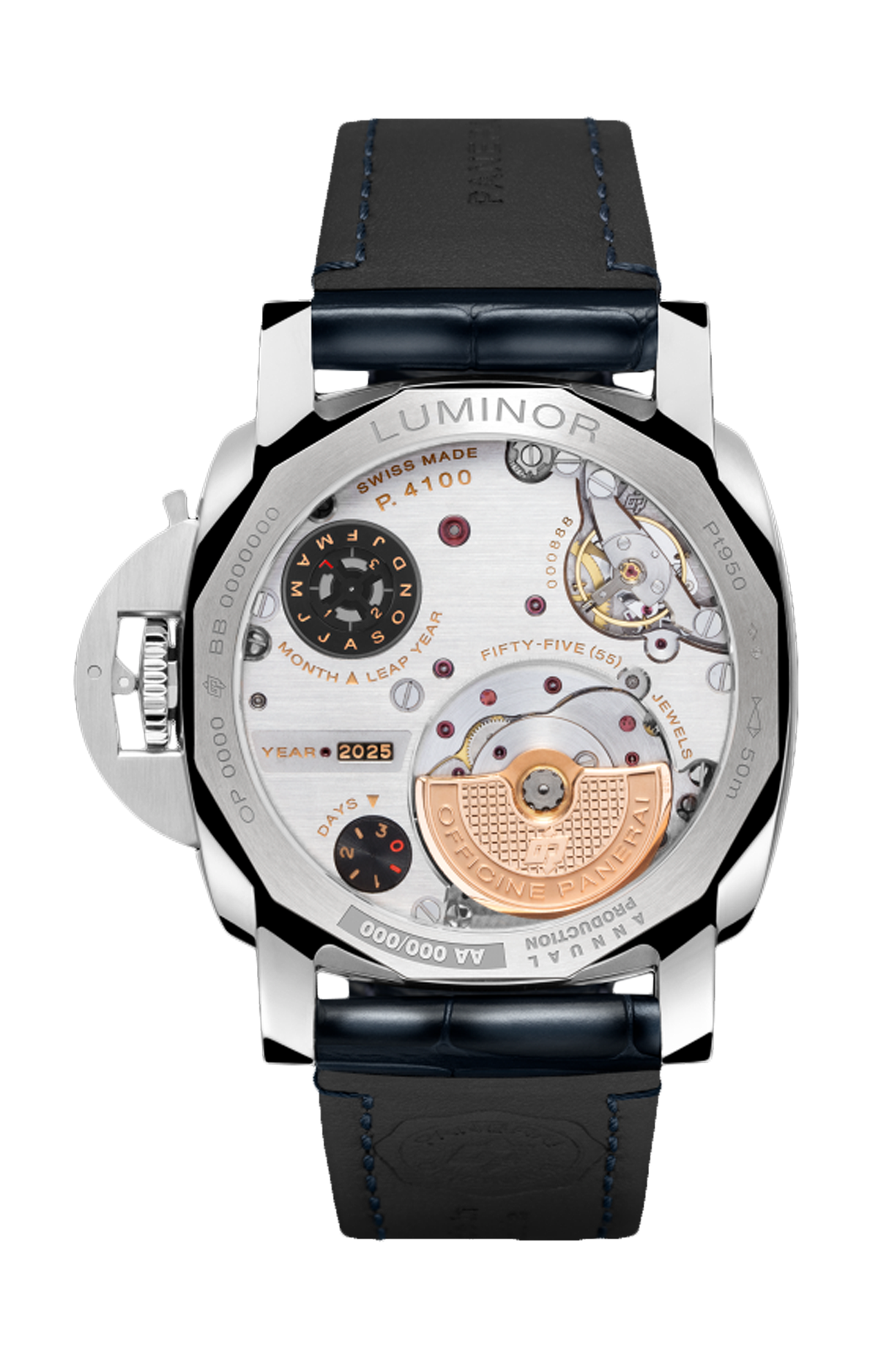A differenza dei tradizionali calendari perpetui che richiedono complesse regolazioni manuali, l’approccio di Panerai garantisce un’interazione semplice. Tutte le funzioni del calendario (tra cui giorno, data, mese e anno bisestile) sono regolabili mediante la corona, eliminando la necessità di pulsanti aggiuntivi. Il design pulito e minimalista permette alla complicazione di rimanere raffinata e altamente funzionale. Il calibro P.4100 garantisce prestazioni impeccabili, con riserva di carica di tre giorni e funzione GMT a doppia indicazione, per la massima praticità tutti i giorni.