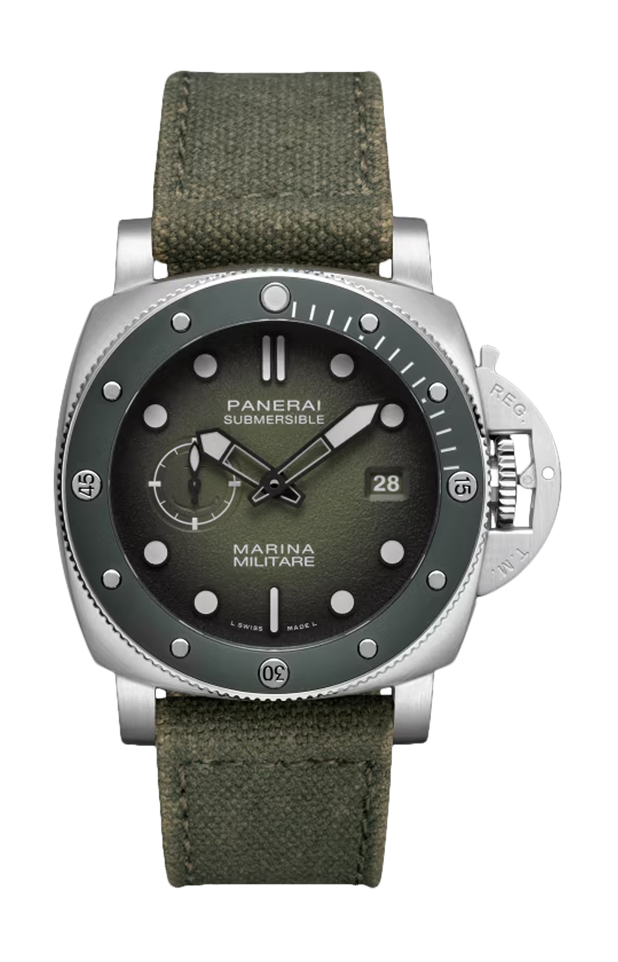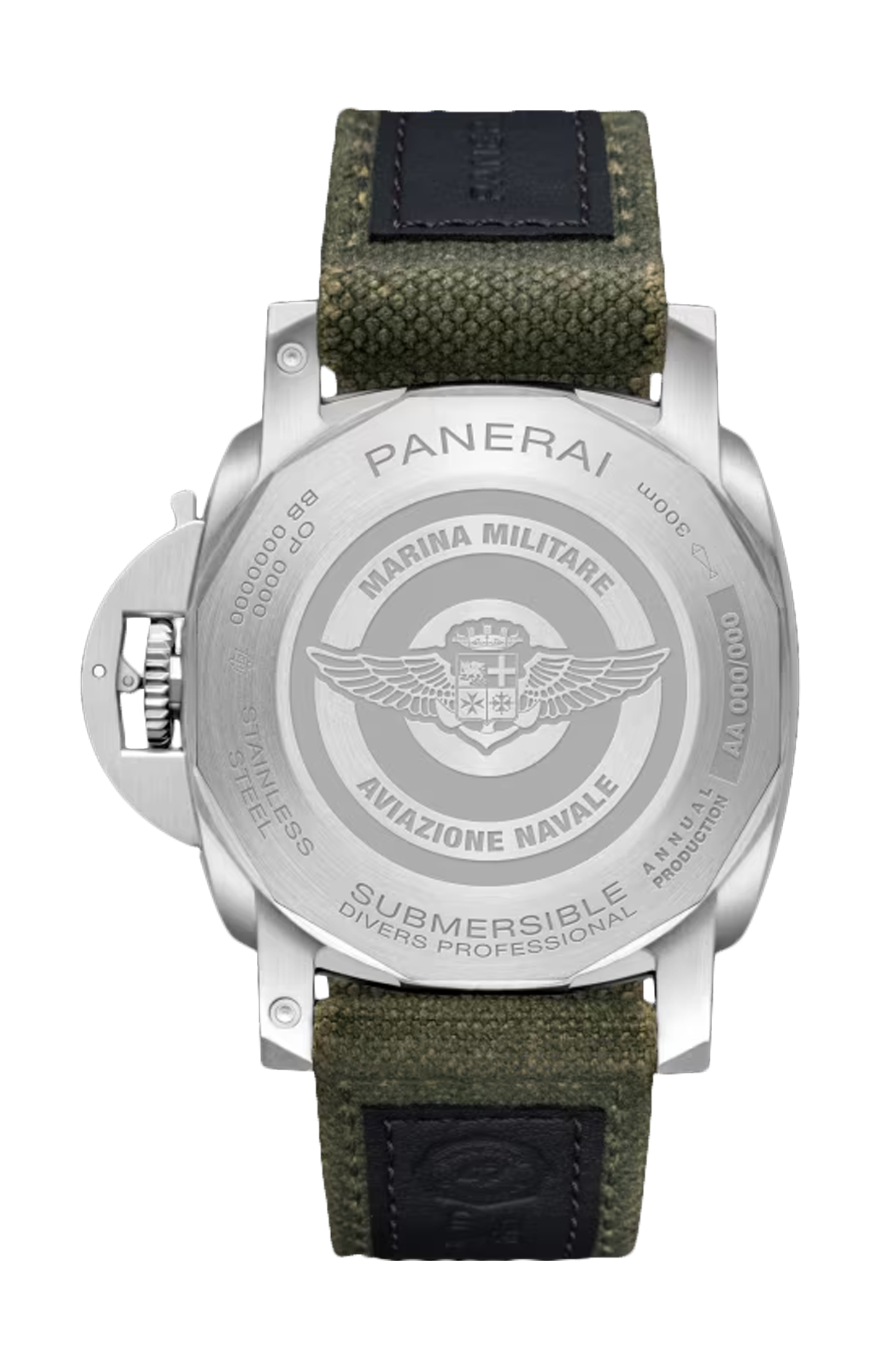 Movimento meccanico a carica automatica, calibro P.900, 12 ½ linee, 4,2 mm di spessore, 23 rubini, 28.800 alternanze/ora. Dispositivo antiurto Incabloc®. Riserva di carica di 3 giorni, un bariletto. 171 componenti. Funzioni ore, piccoli secondi, datario a finestrella, minuti. Cassa diametro 44 mm, acciaio satinato. Lunetta girevole unidirezionale in acciaio con disco in ceramica verde opaca. Fondello a vite, in acciaio satinato. Quadrante verde opaco granulato, con finitura sfumata nera, con indici e punti luminescenti in Super-Luminova® grade X2 grigio. Datario a ore 3, piccoli secondi a ore 9. Impermeabilità 30 ATM. Cinturino in tessuto verde scuro, STD, 24/22, fibbia in acciaio satinato trapezoidale, 22 mm, Luminor 44-47 mm, Radiomir 45-47-48 mm e Radiomir 1940 47 mm e Mare Nostrum 52 mm. Dispositivo proteggi corona protetto da trademark. Secondo cinturino incluso caucciù nero.