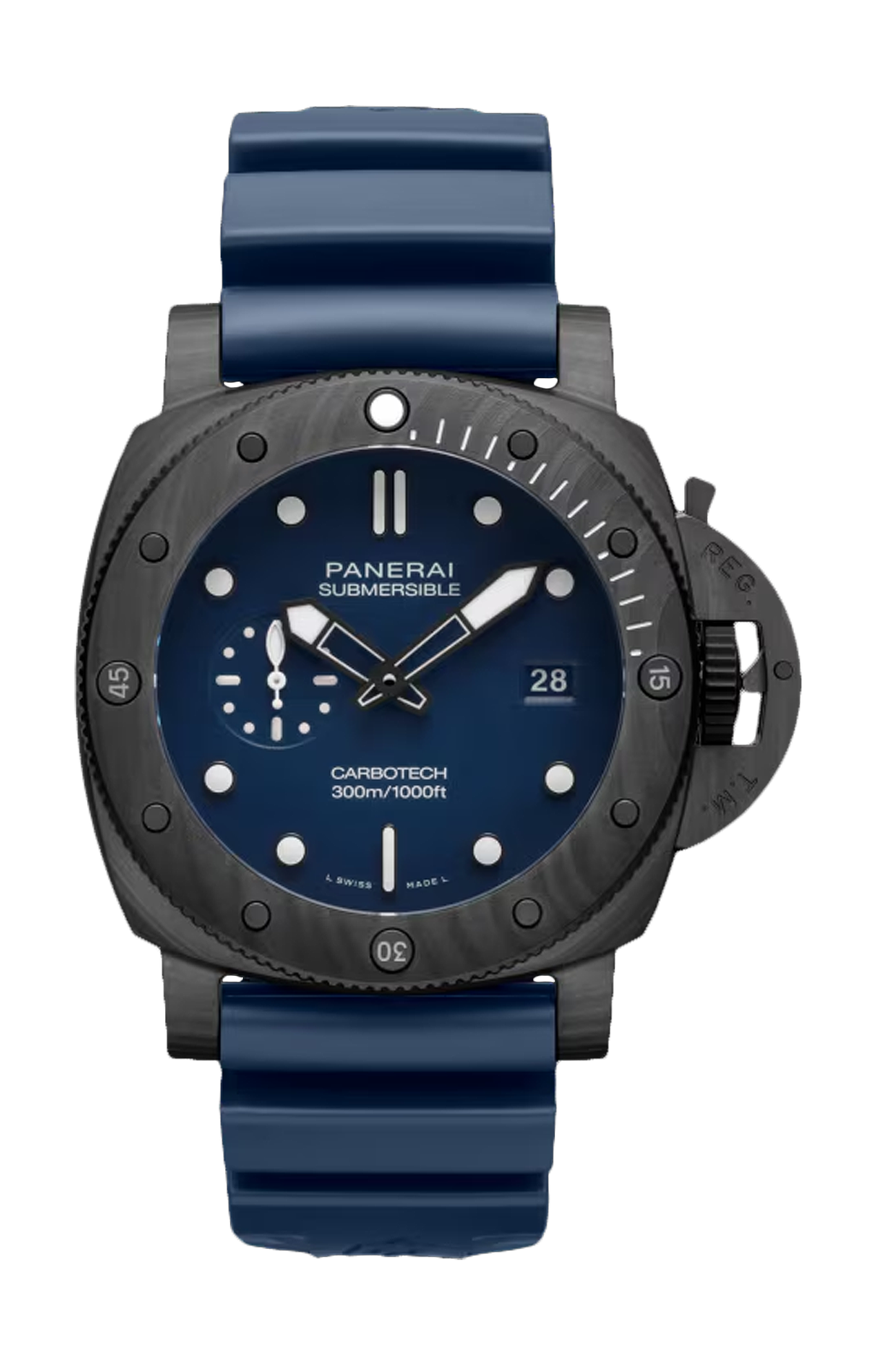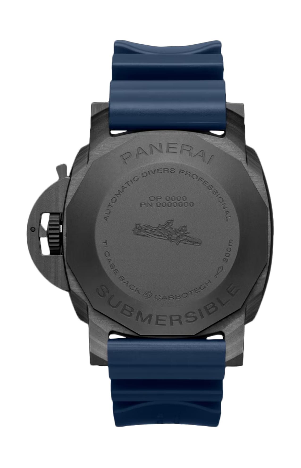 Meccanico a carica automatica, calibro P.900, 12 ½ linee, 4,2 mm di spessore, 23 rubini, 28.800 alternanze/ora. Dispositivo antiurto Incabloc®. Riserva di carica di 3 giorni, un bariletto. 171 componenti. Funzioni con ore, piccoli secondi, minuti, datario a finestrella. Cassa 44mm Carbotech™, lunetta girevole antioraria con scala graduata Carbotech™. Fondello in titanio con viti e rivestimento nero. Quadrante blu con indici e punti luminosi. Data a ore 3, piccoli secondi a ore 9. Impermeabilità fino a 300 metri. Cinturino in caucciù blu scuro, STD, 24/22, BA. Fibbia in titanio trapezoidale con trattamento DLC, 22 mm, Luminor 44-47 mm, Radiomir 45-47-48 mm e Radiomir 1940 47 mm. Secondo cinturino incluso in tessuto blu.