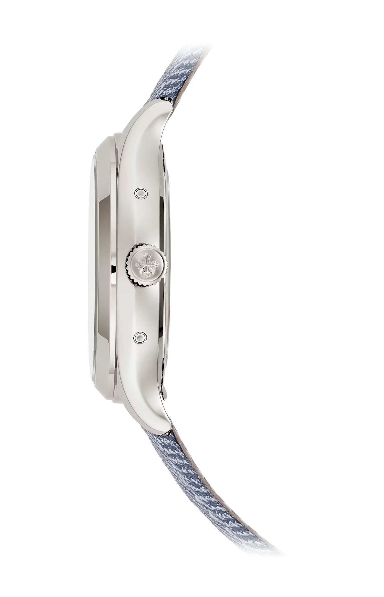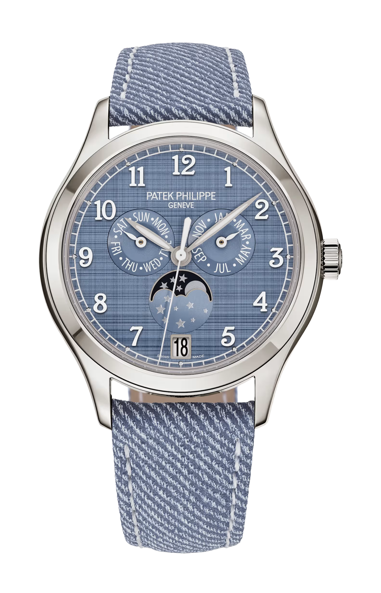 Un Calendario Annuale in oro bianco con quadrante caratterizzato da un motivo “shantung” blu-grigio e un cinturino adatto a qualsiasi polso. Patek Philippe propone una variante moderna con cassa in oro bianco e quadrante blu-grigio del Calendario Annuale in oro rosa, entrato a far parte della collezione nel 2025. Con l’arrivo di questo nuovo modello, la Manifattura amplia la sua selezione di orologi complicati e orologi con calendario per tutti i polsi.