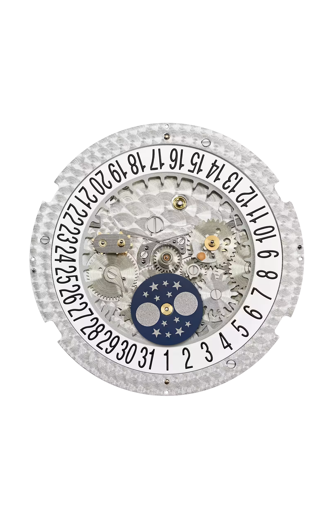Questa attenzione alla leggibilità e allo stile si riflette anche nei contatori delle fasi lunari, del giorno e del mese con finitura azurée (a cerchi concentrici). Dotato di fibbia ad ardiglione in oro bianco, un cinturino in pelle di vitello blu-grigio con motivo denim e cuciture bianche a contrasto accentua il look decisamente contemporaneo di questo modello.