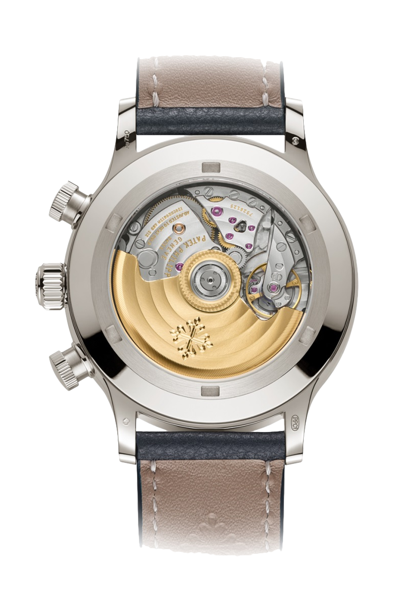 Patek Philippe presenta il suo primo modello cronografo nella sua linea di orologi stile pilot, dotato di doppio fuso orario Travel Time e di indicazione della data a lancetta associata all’ora locale. Questo nuovo modello automatico, dall’estetica originale e molto riconoscibile, è proposto in due versioni in oro bianco: la Ref. 5924G-001, con quadrante blu-grigio soleil e cinturino in vitello blu marino martellato, e la Ref. 5924G-010, con quadrante laccato verde kaki e cinturino verde oliva con finitura vintage. I quadranti sono dotati di cifre applicate e di lancette a gladio in oro bianco con rivestimento luminescente.