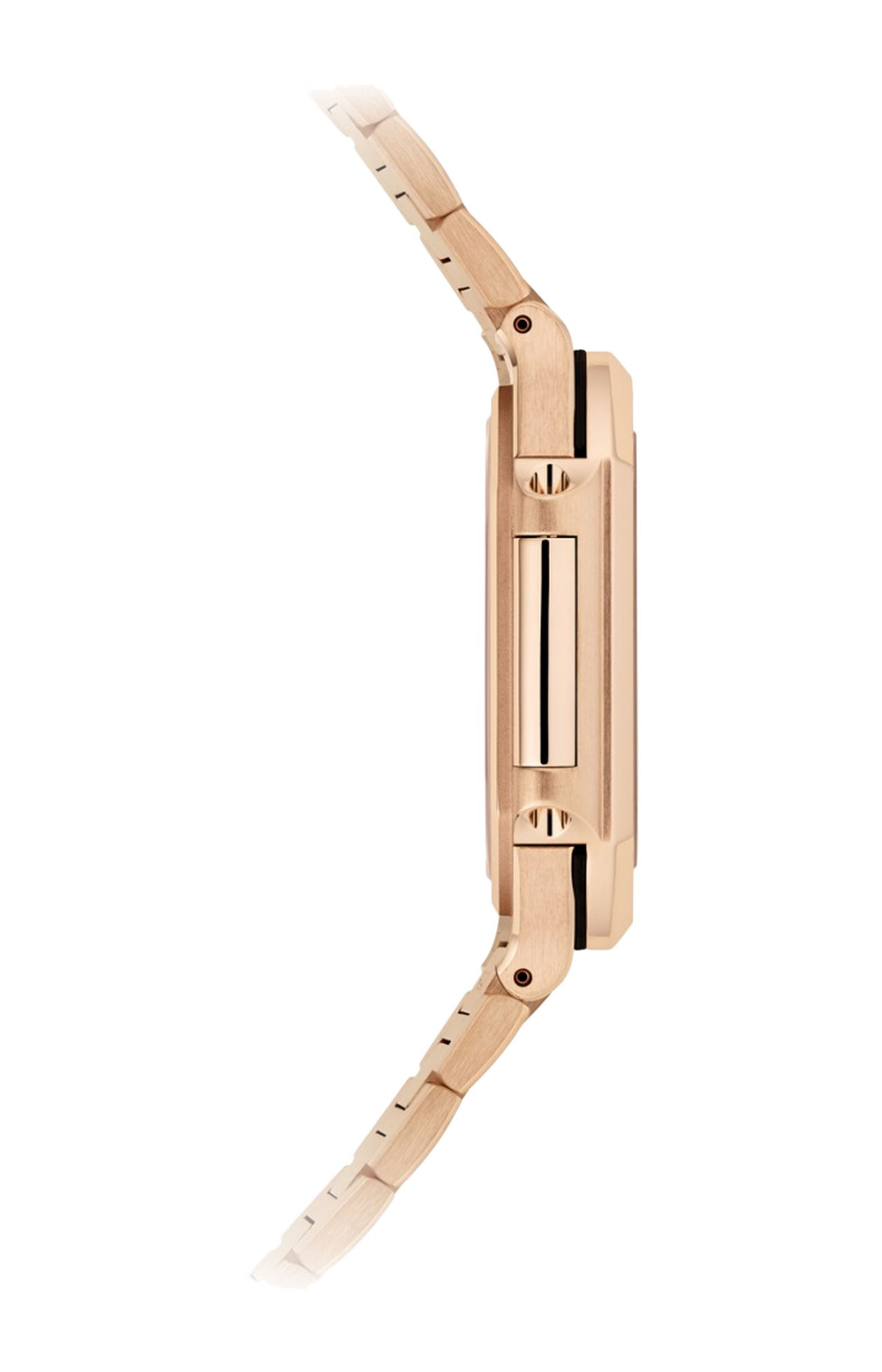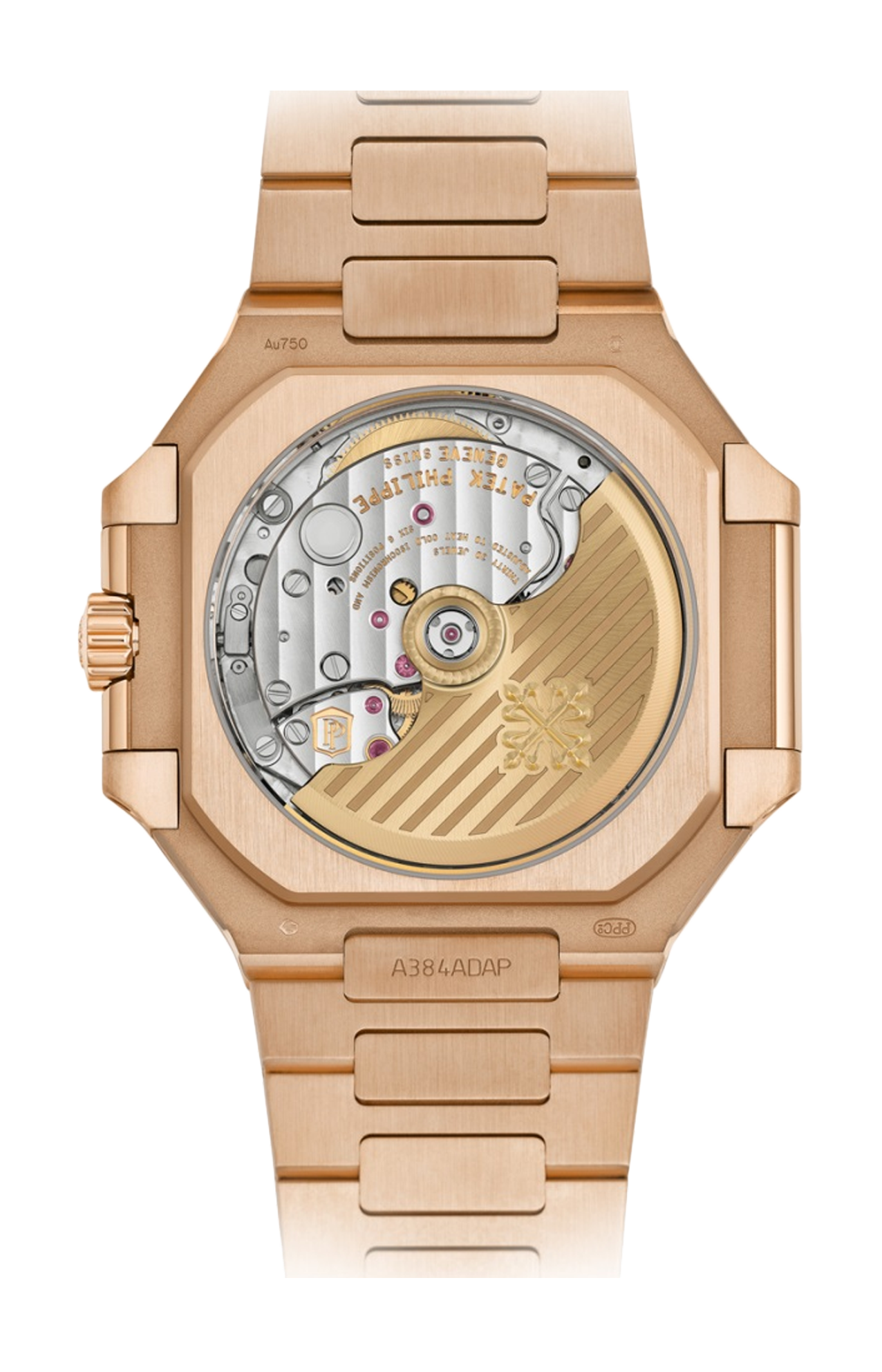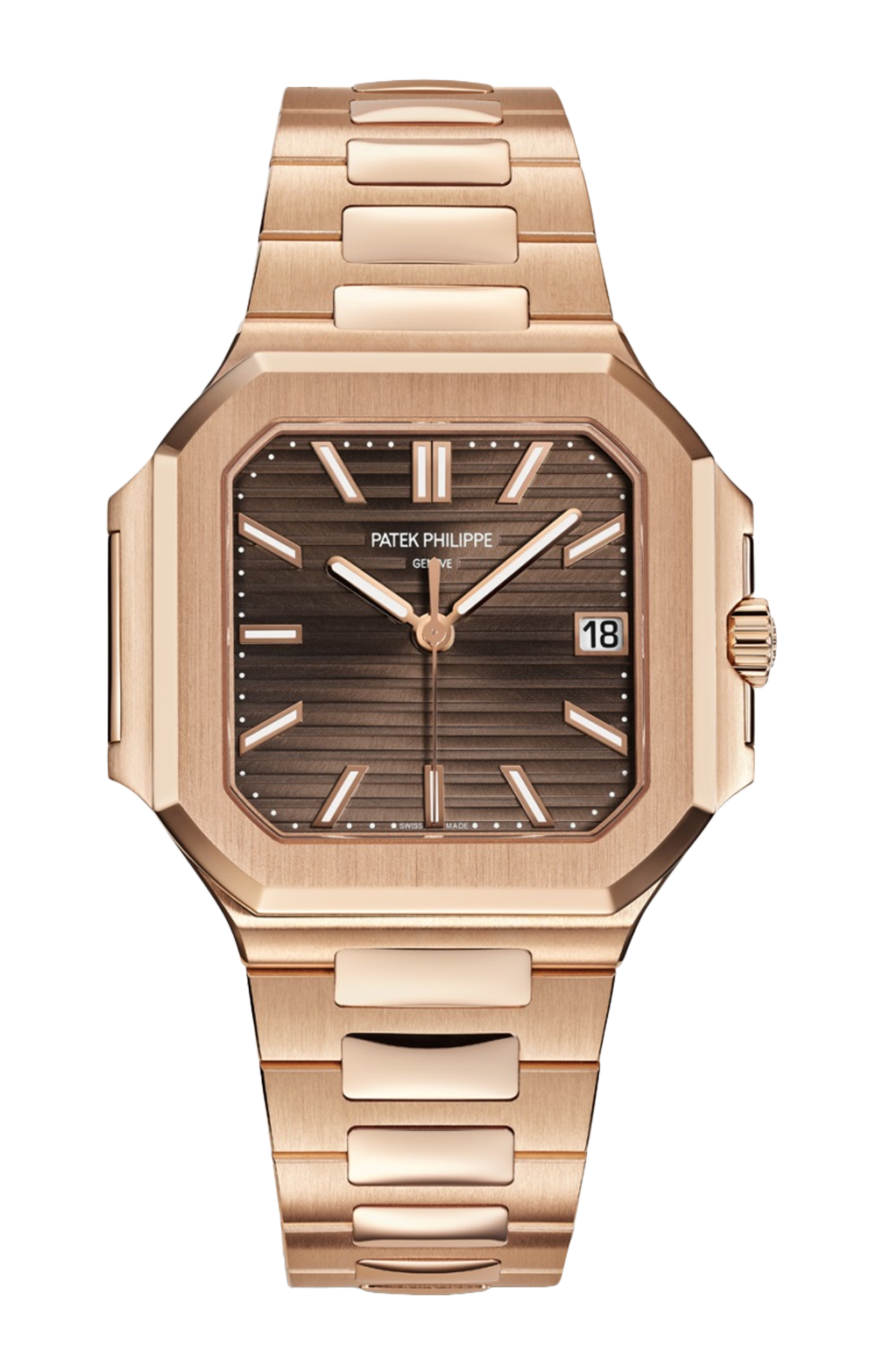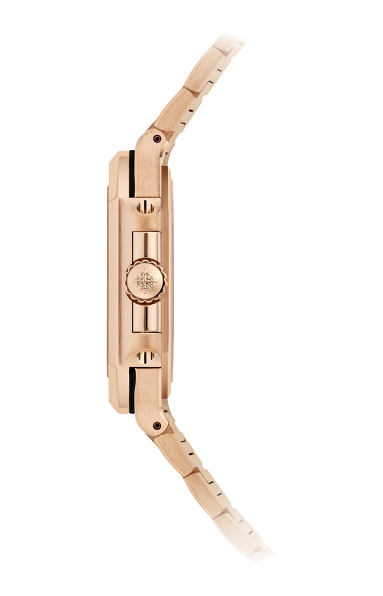 Patek Philippe reinventa lo stile casual chic in un nuovo Cubitus in oro rosa taglia medium con un diametro di 40 mm che si adatta a ogni polso. Il design decisamente moderno è impreziosito dall'alternanza delle finiture satinate verticali e lucide sulla cassa e sul bracciale. Il quadrante con motivo orizzontale a rilievo sfoggia un elegante colore bruno animato da una raffinata finitura soleil. Il calibro 26-330 S a carica automatica è dotato di un rotore centrale in oro 21 carati decorato con lo stesso motivo orizzontale a rilievo del quadrante: la firma distintiva dei modelli Cubitus.