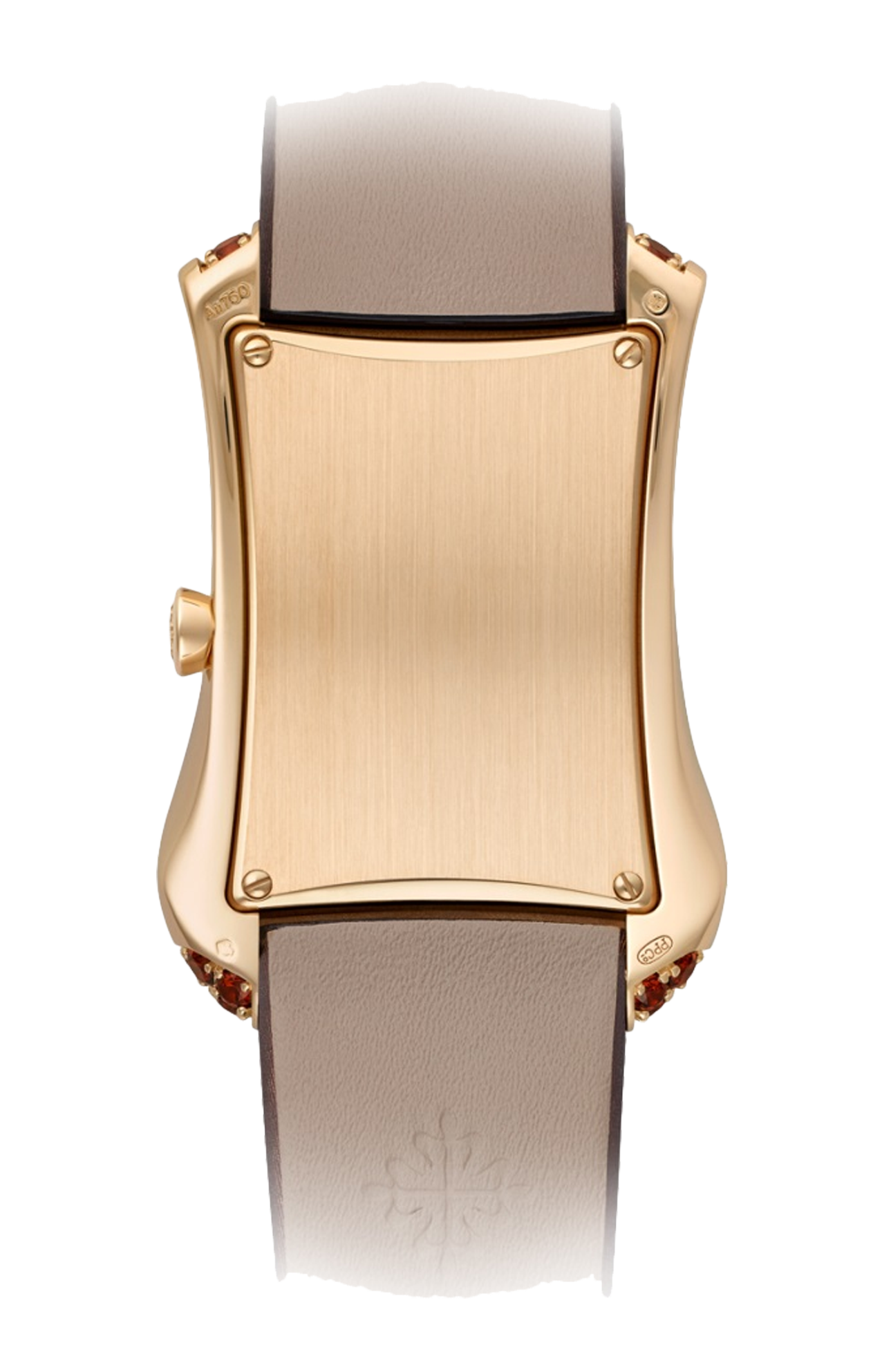 Orologio gioiello dallo stile inedito e dall’eleganza senza tempo, il gondoLO serata ritorna nella collezione attuale Patek Philippe in una nuova versione in oro rosa leggermente più grande della precedente. Sulla cassa sono incastonate 94 spessartiti taglio brillante (2,02 ct) disposte in doppio dégradé di colori dai toni “cognac” a ore 12 e a ore 6 fino ai toni “mandarino” a ore 9 e a ore 3. Il quadrante laccato bruno siorna di un motivo floreale che gioca sul contrasto tra finiture opache e lucide. Il cinturino in vitello bruno cioccolato con finiture satinate richiama il colore del quadrante.