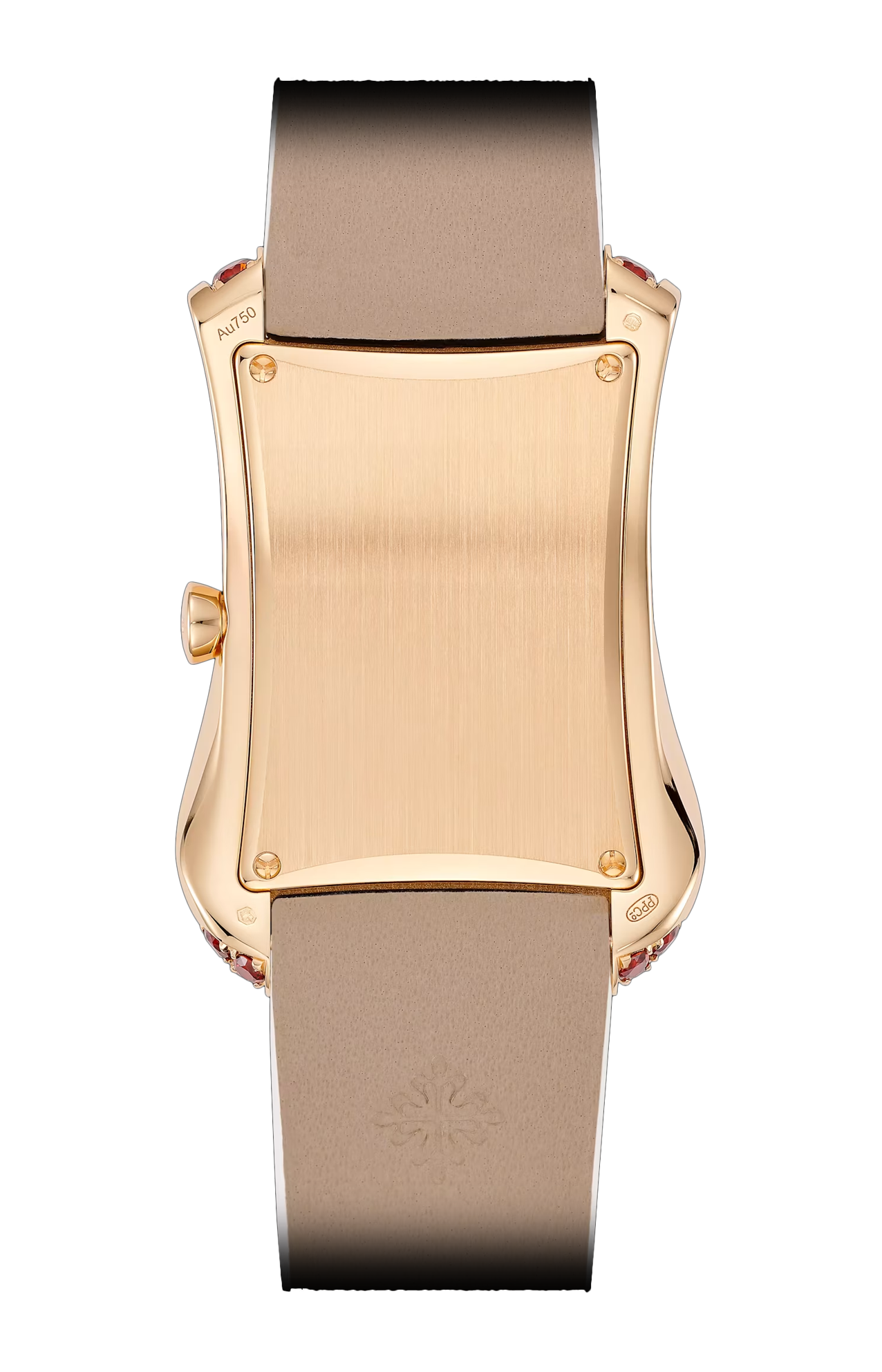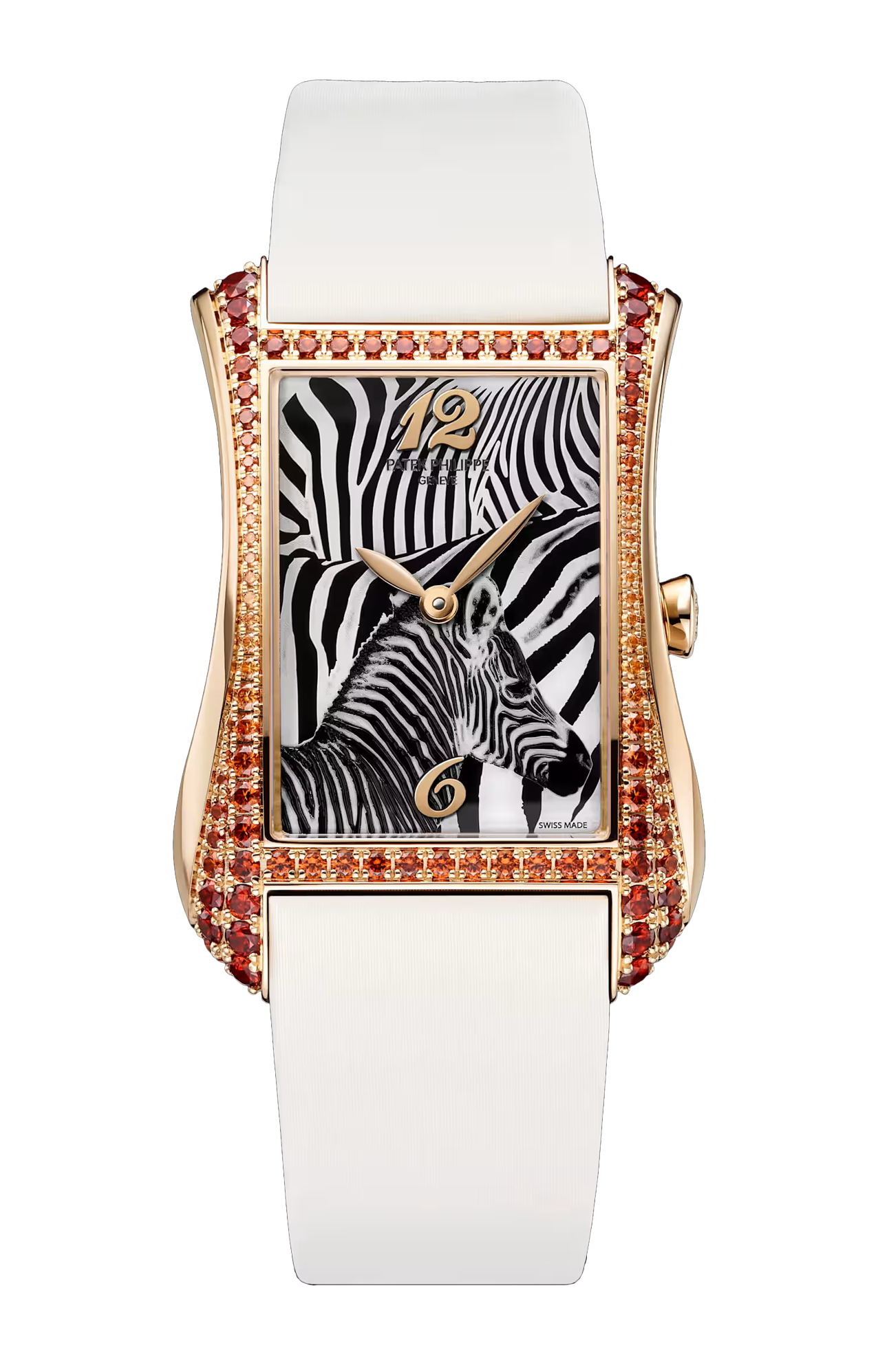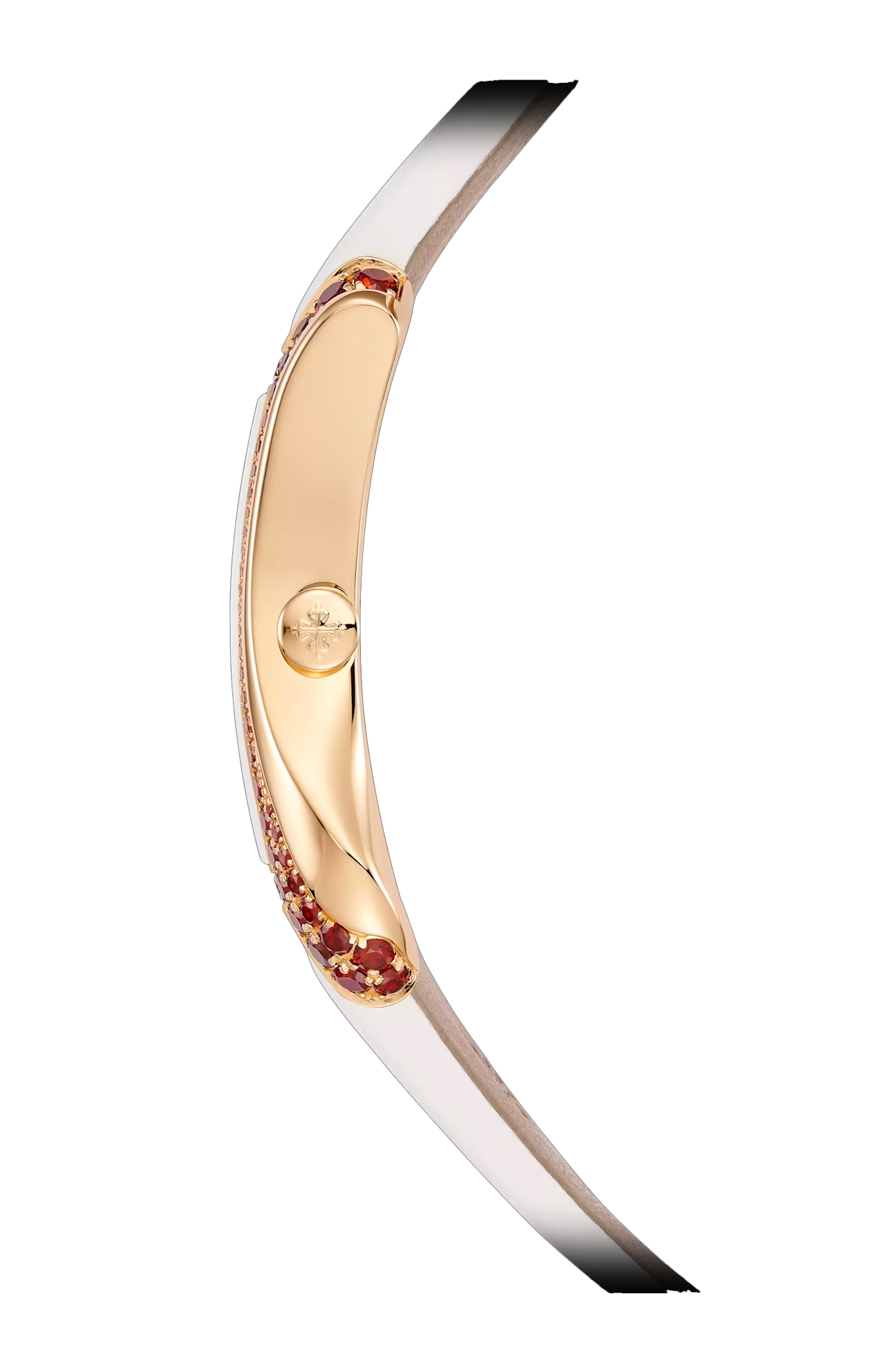 Il nuovo gondoLO serata si distingue per il quadrante in vetro zaffiro con un originale motivo zebRato che crea sorprendenti effetti di volume e profondità. La cassa in oro rosa è impreziosita da 94 spessartiti taglio brillante (2,02 carati) disposte in una doppia sfumatura di colore che spazia dal cognac al mandarino, accentuandone il profilo delicatamente "a vita" e le curve asimmetriche.