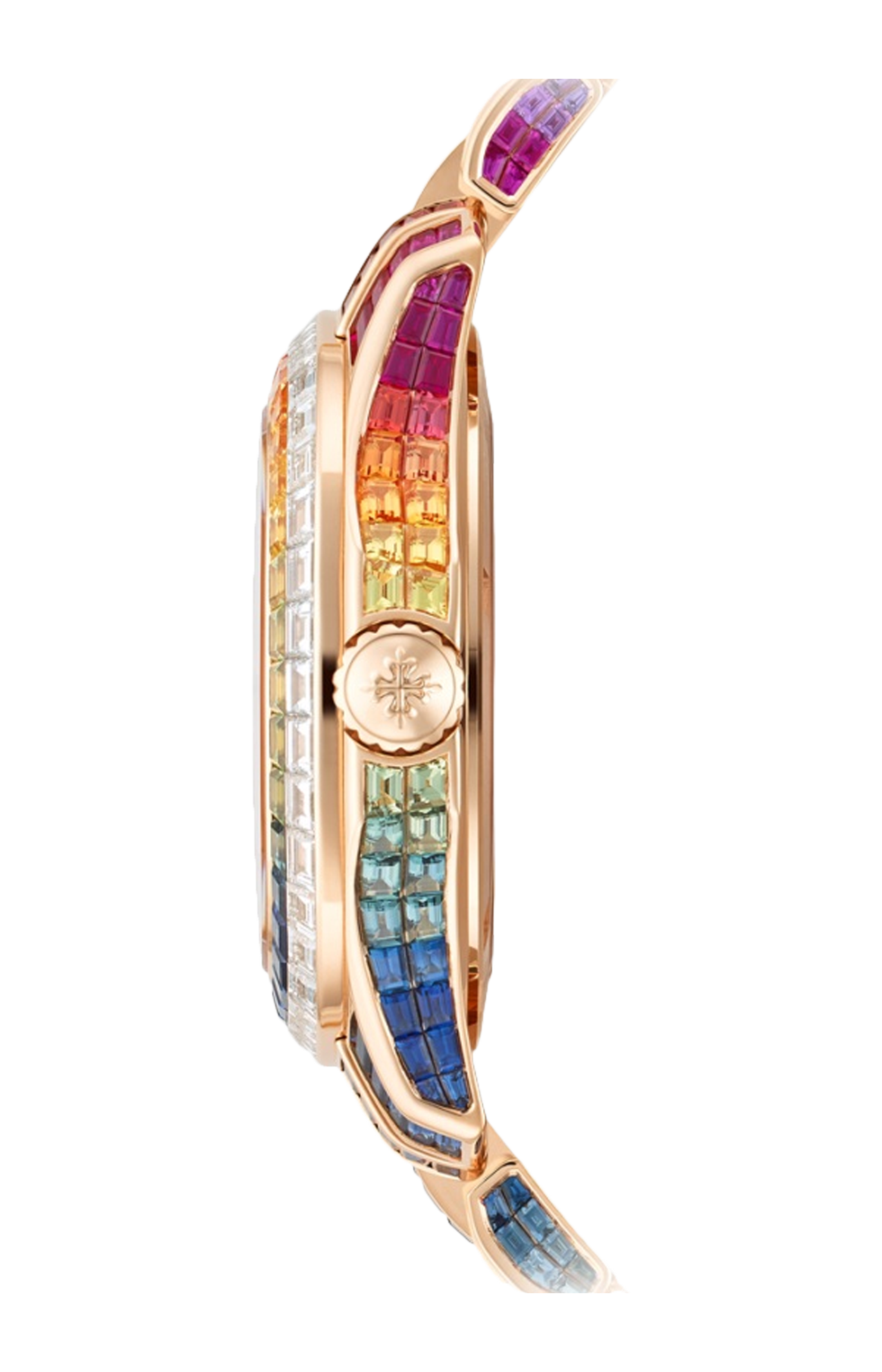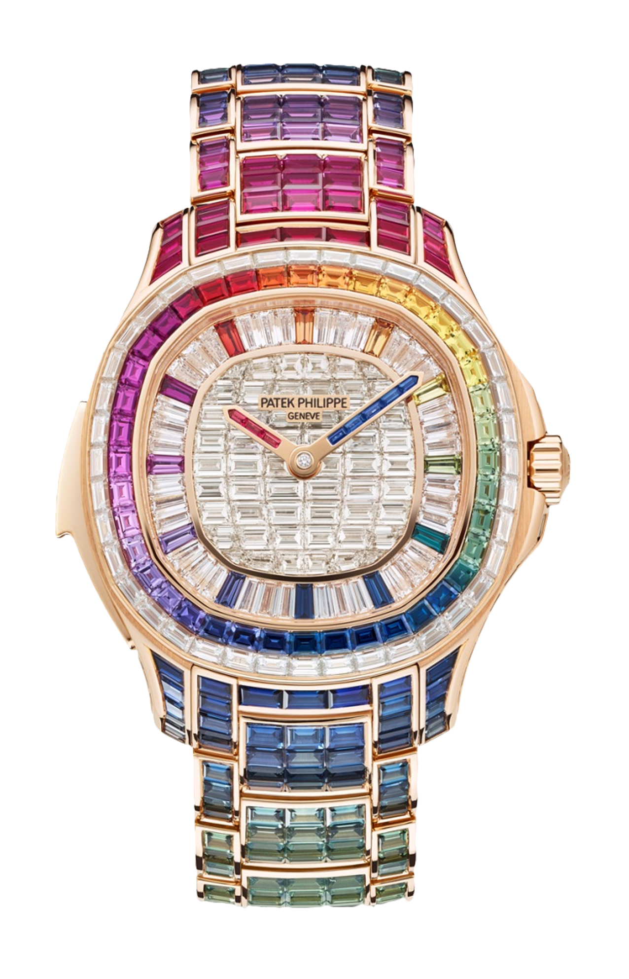 Patek Philippe introduce la prima grande complicazione nella collezione “Sporty Chic Contemporaneo” da donna Aquanaut Luce. Questa ripetizione minuti Haute Joallerie è tempestata di 130 diamanti a baguette (8,66 ct) sul quadrante e 779 zaffiri multicolori a baguette (45,05 ct) che formano un arcobaleno sulla lunetta, i fianchi della cassa e il bracciale, incassati con la sofisticata tecnica di “incastonatura invisibile”. Il quadrante ospita dodici indici in zaffiri multicolori, un giro delle ore in diamanti, una lancetta delle ore impreziosita da rubini e una dei minuti con zaffiri blu. Il fondo in cristallo di zaffiro permette di ammirare il calibro R 27 a carica automatica con i suoi due timbri classici.
