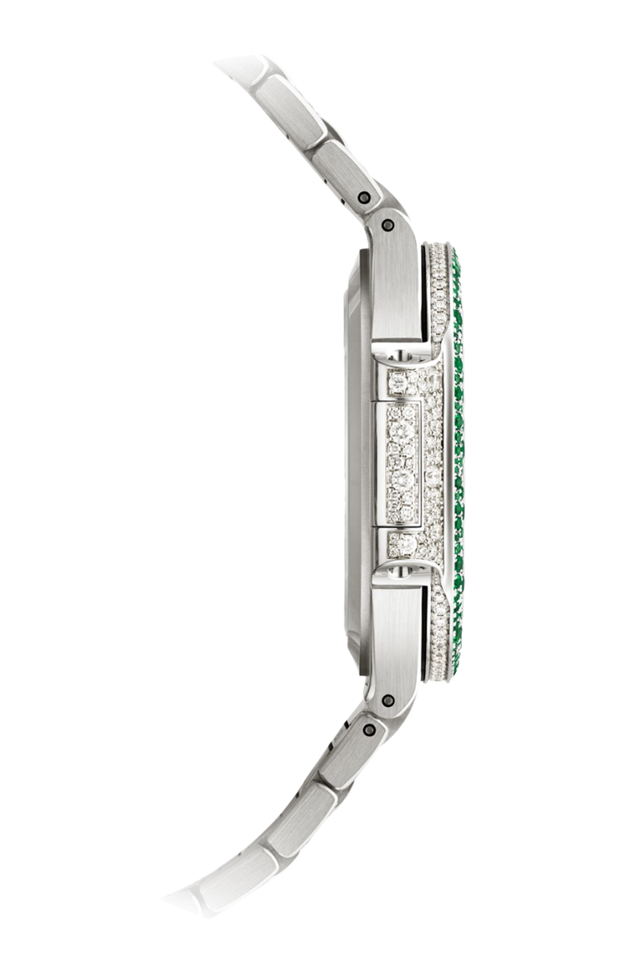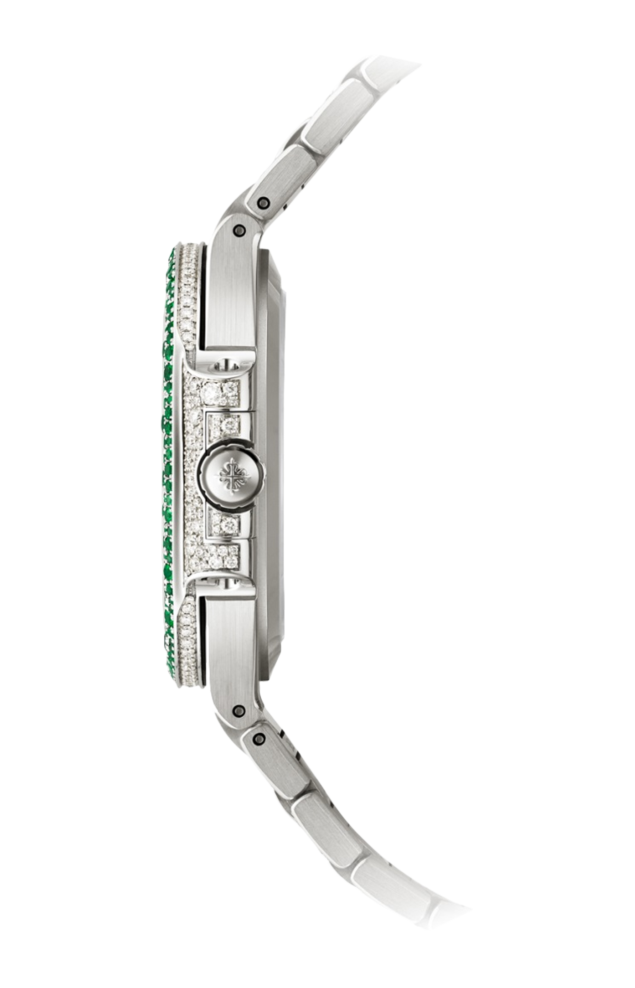 Patek Philippe firma un’inedita alleanza tra il design “sportivo elegante” e l’haute joaillerie in un modello Nautilus da donna reso ancor più prezioso da 1500 diamanti taglio brillante (6,53 ct) e 876 smeraldi (3,68 ct), con cassa, lunetta e bracciale con incastonatura “effetto neve”. La lunetta e le maglie interne del bracciale tempestade di smeraldi valorizzano in maniera pregevole la geometria inimitabile della collezione Nautilus. Il quadrante in oro bianco non passa inosservato grazie alle sue file di diamanti taglio brillante disposte secondo il tipico motivo a piccole onde della collezione Nautilus da donna. Il calibro 26-330 S a carica automatica è visibile attraverso il fondo in cristallo di zaffiro trasparente. Il bracciale è dotato di un fermaglio déployant brevettato Patek Philippe, reso sicuro da quattro punti di attacco indipendenti.
