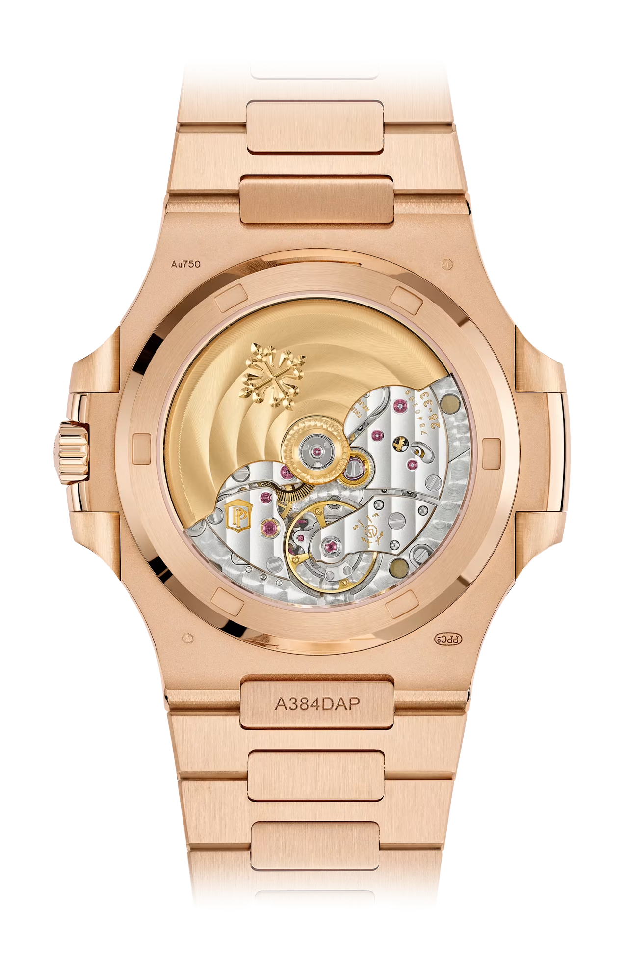 La Manifattura impreziosisce il design del Nautilus con una cassa in oro rosa e una lunetta incastonata con 32 diamanti taglio baguette (3,79 ct). Questa eccezionale raffinatezza è ulteriormente accentuata dal quadrante marrone con finitura a raggio di sole, bordo sfumato nero e motivo orizzontale in rilievo. Il calibro a carica automatica 26-330 S C, dotato di meccanismo di arresto dei secondi, anima questa icona di eleganza sportiva.