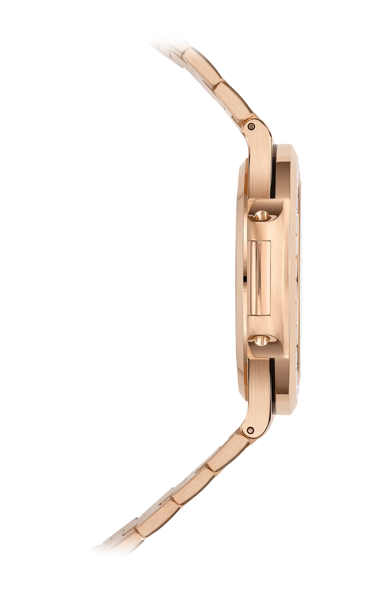 Cassa, lunetta e bracciale in oro rosa, impreziositi da finiture lucide e satinate a contrasto.