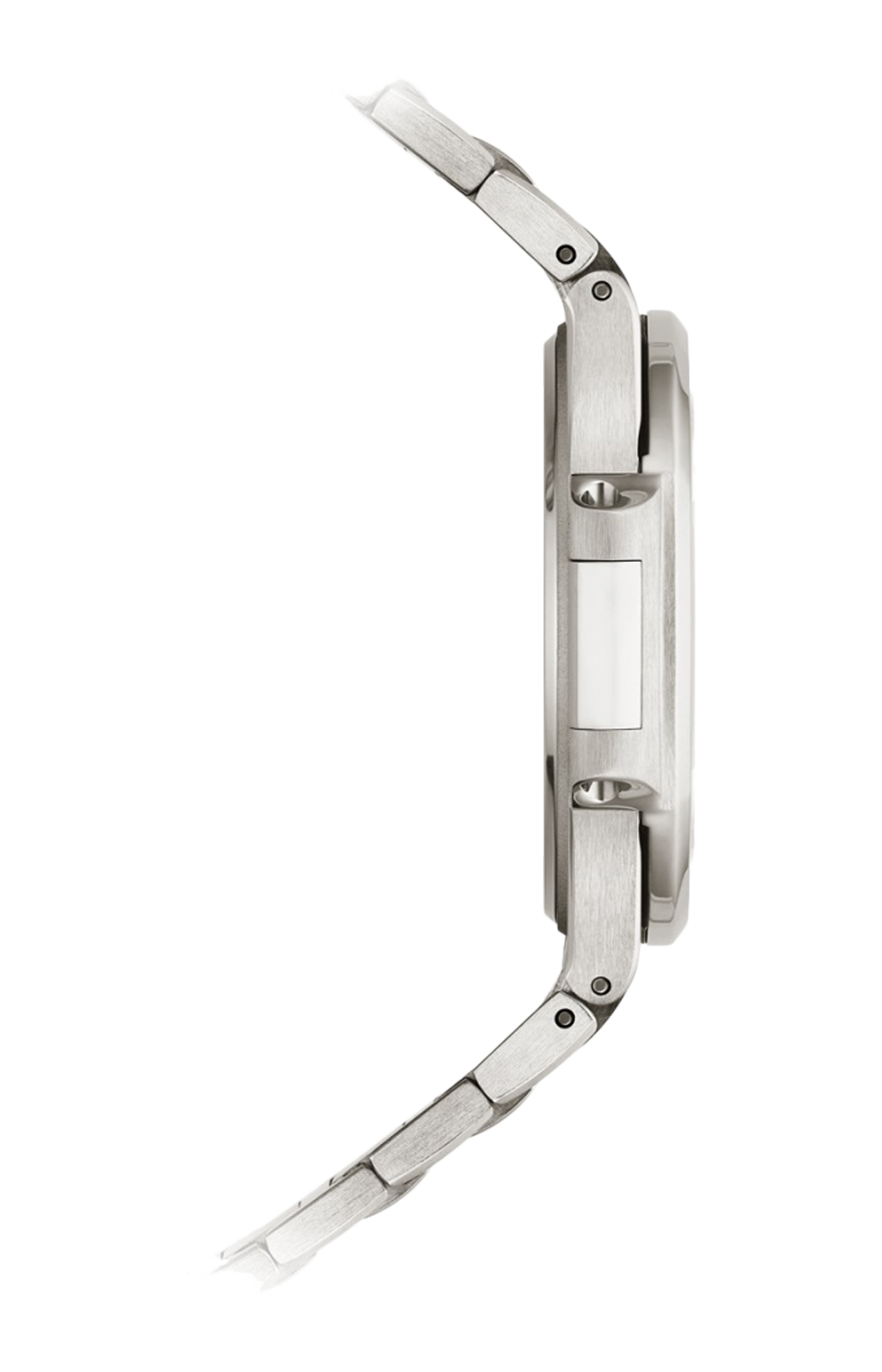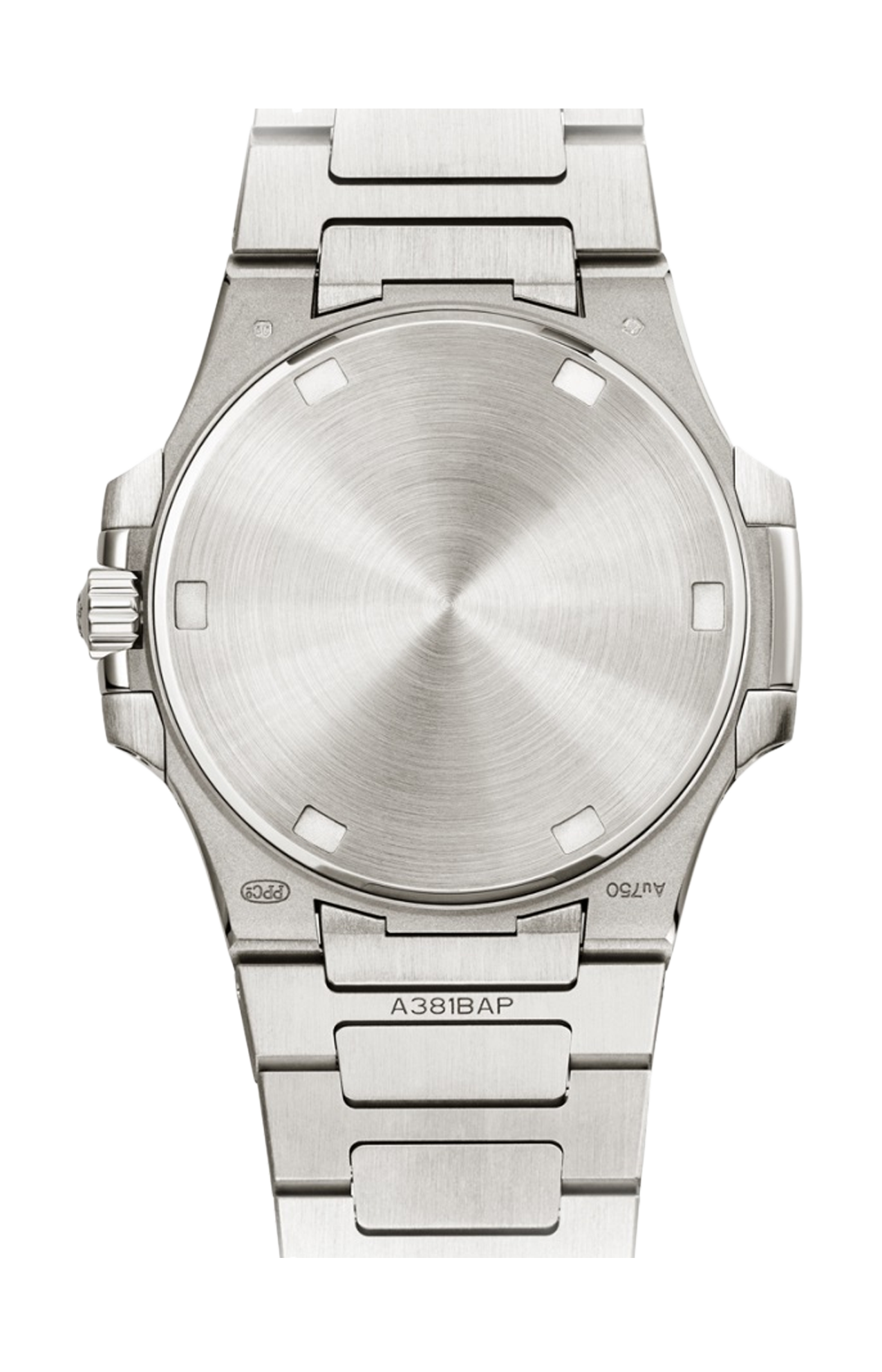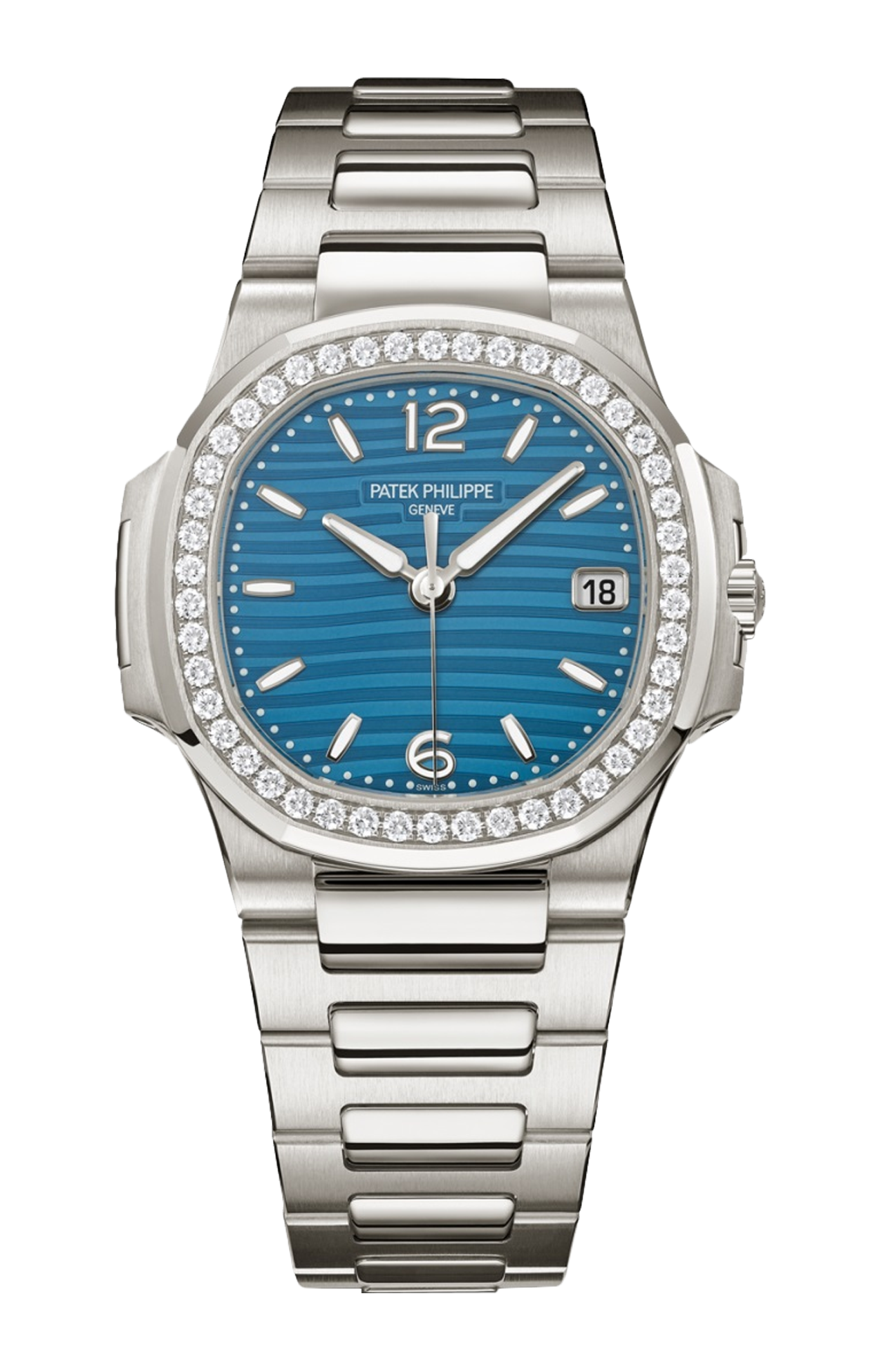 Nuova versione del Nautilus per signora con movimento al quarzo, cassa di 32 mm di diametro e bracciale in oro, questo orologio è sinonimo di innovazione con il colore azzurro del suo quadrante laccato con motivo a onde, tipico di questa collezione. La cassa ispirata alla sagoma di un oblò sa catturare l’attenzione grazie alla sua alternanza di finiture satinate e lucide. La lunetta è illuminata da una fila di 46 diamanti taglio brillante (0,8 ct). Il bracciale in oro bianco, anch’esso impreziosito dalle finiture a contrasto, è dotato di un sistema di regolazione bloccabile e di una fibbia déployante brevettata Patek Philippe con quattro punti di attacco indipendenti.