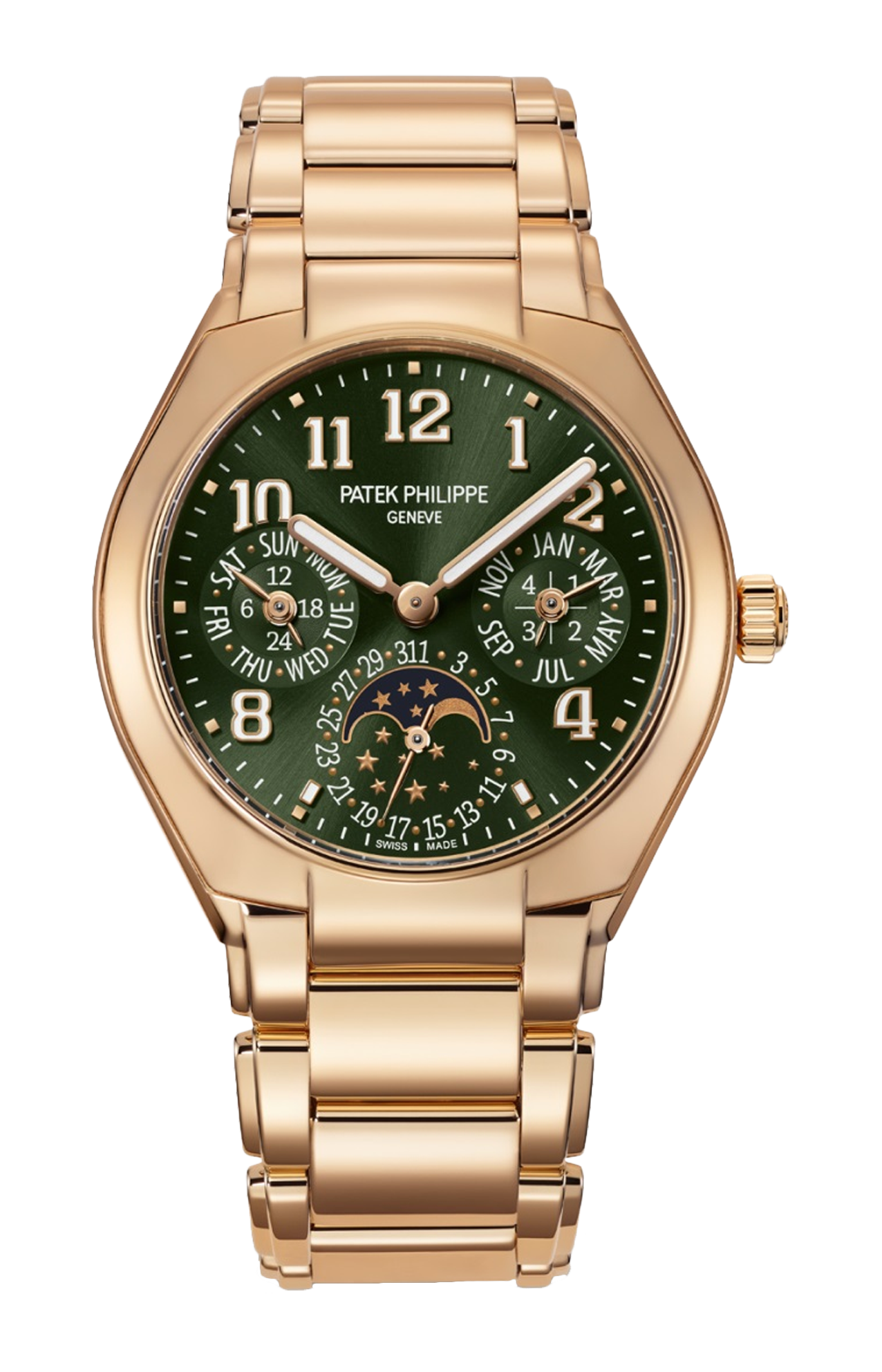 Primissima complicazione nella collezione Twenty~4 e primo Twenty~4 tondo privo di incastonature, questo calendario perpetuo in oro rosa si distingue per il suo quadrante di un elegante verde oliva soleil, delicato e moderno al tempo stesso. Nel cuore della cassa interamente lucida batte il calibro 240 Q a carica automatica, un movimento ultrapiatto che conferisce all’orologio un profilo di elegante sottigliezza. Il calendario completo giorno/data/mese tiene conto automaticamente della durata variabile dei mesi, anche negli anni bisestili. Il bracciale in oro rosa è dotato di una fibbia déployante brevettata, resa sicura da quattro punti di attacco indipendenti.