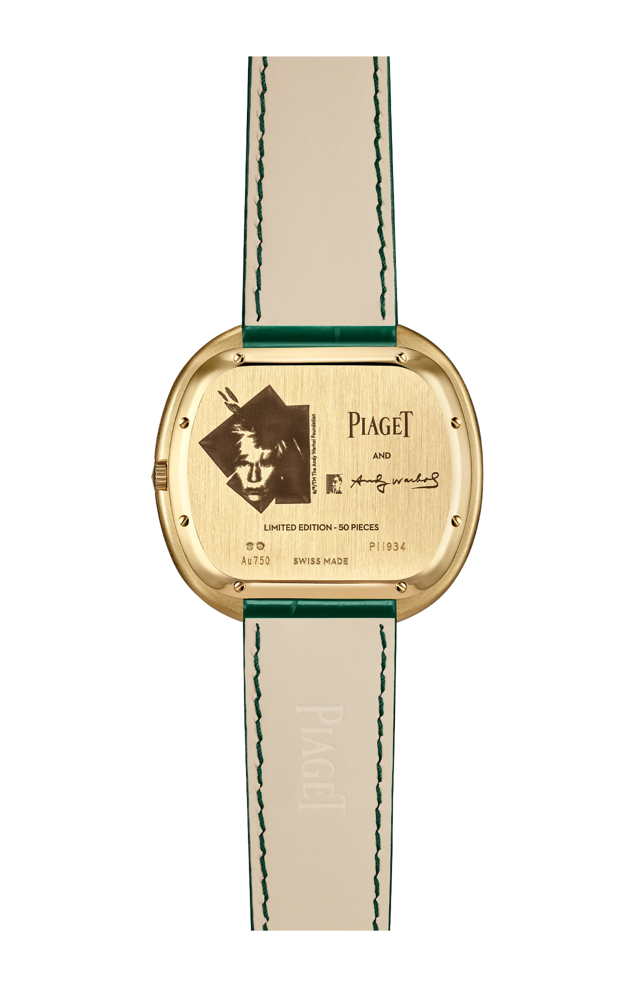 Orologio Andy Warhol, 45 x 43 mm. Cassa in oro giallo 18 carati. Quadrante in onice con serpentino giallo, opale rosa e crisoprasio verde. Cinturino in pelle di alligatore verde. Movimento meccanico automatico di manifattura 501P1.