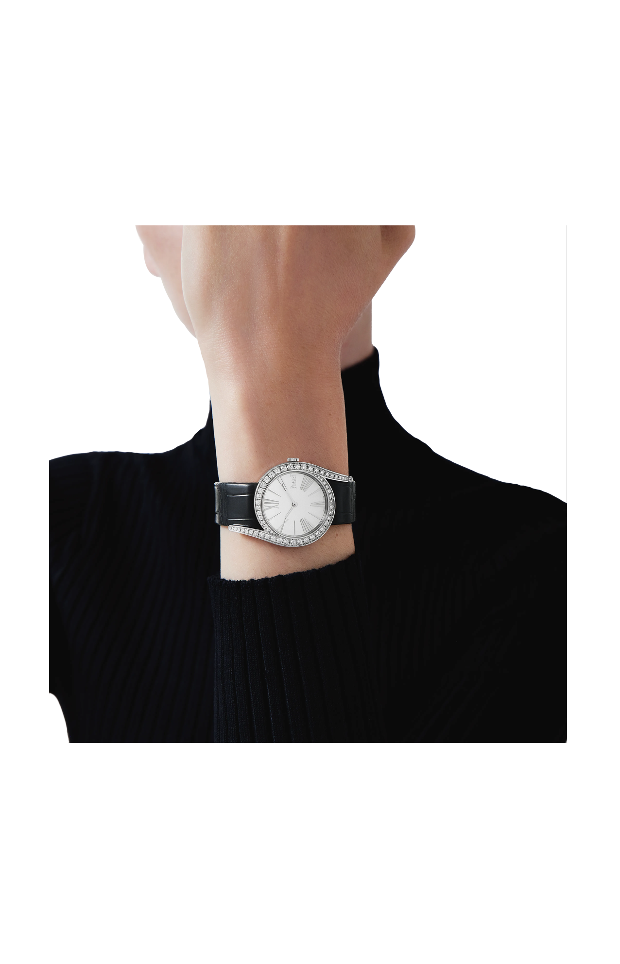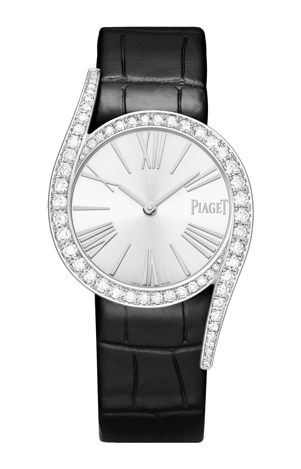 Il nuovo orologio da donna di Piaget può essere riassunto in tre parole: radioso, vivace e seducente. Elimina la linearità del tempo, collocandola invece su una curva di pura femminilità. La cassa rotonda da 32 mm è impreziosita da due eleganti anse allungate e la voluttà delle sue curve è esaltata sulla lunetta da una fila di diamanti tondi sfumati. L'aspetto puro del quadrante soleil conferisce un fascino contemporaneo e al tempo stesso classico, con i numeri romani applicati argentati e il cinturino in alligatore nero.