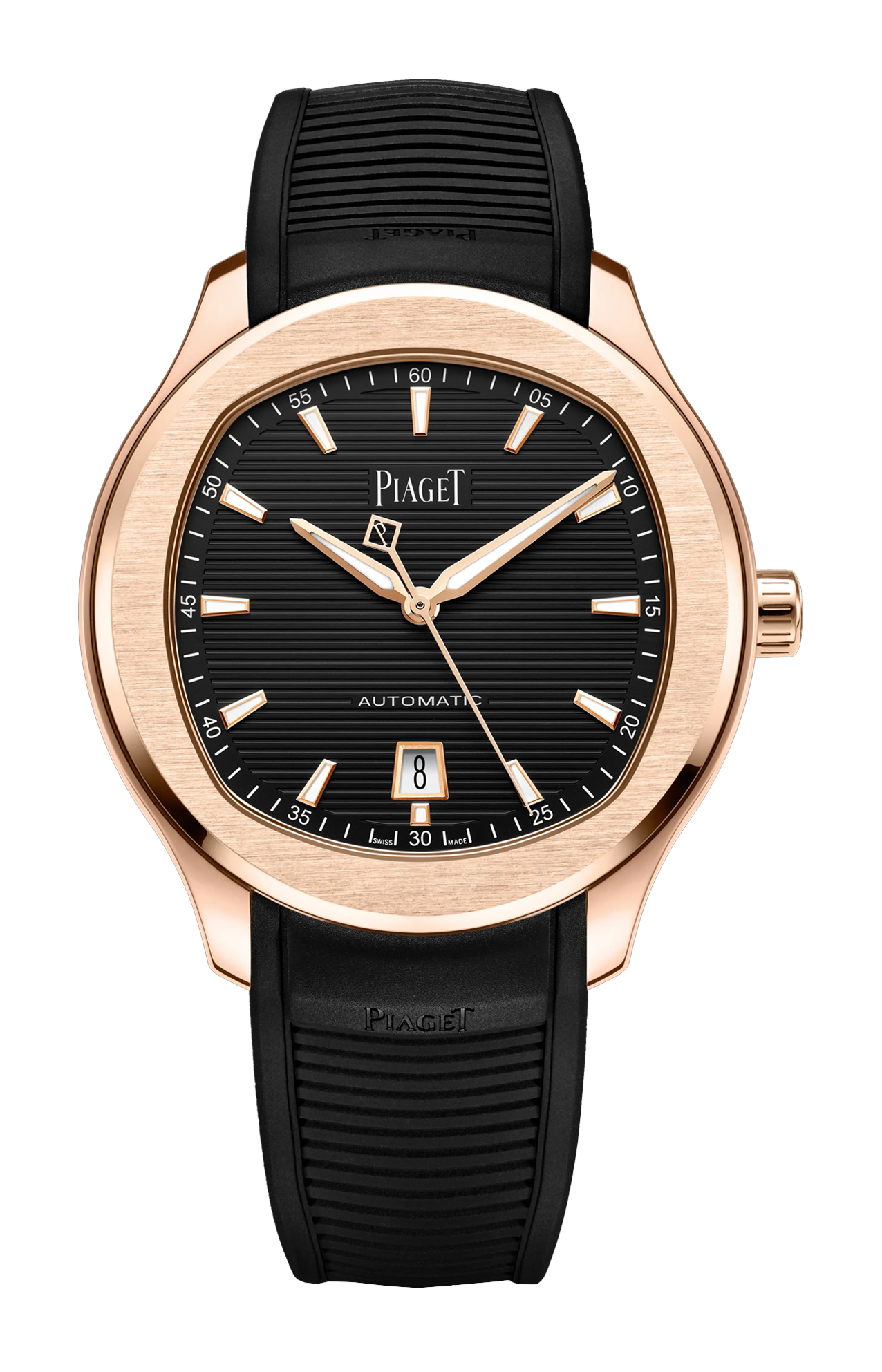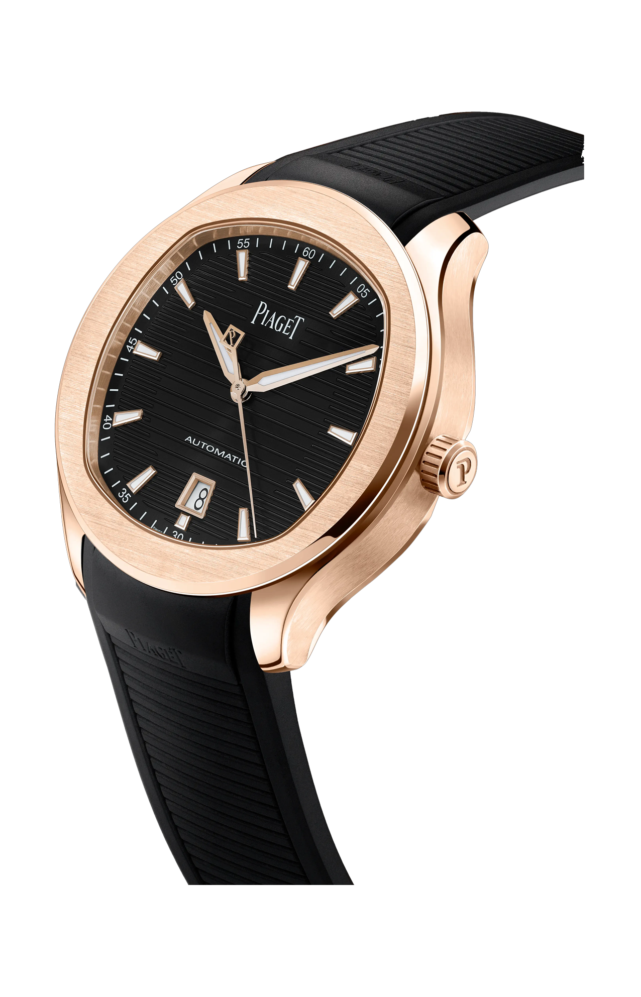 Orologio Piaget Polo Date, 42 mm. Cassa in oro rosa 18 carati. Quadrante con indici e lancette rivestiti in Superluminova®. Quadrante nero e cinturino in caucciù nero. Fondello in vetro zaffiro. Movimento meccanico automatico di manifattura 1110P.
