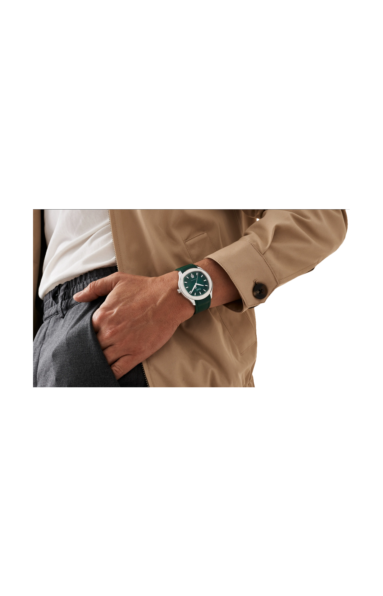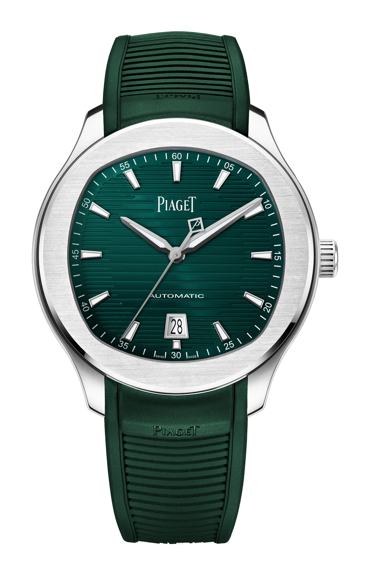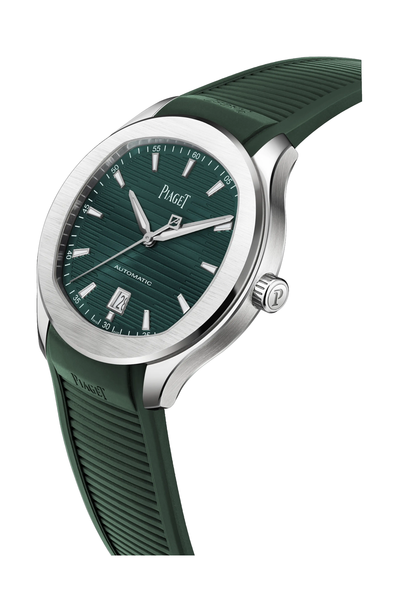 Orologio Piaget Polo Field, 42 mm. Cassa in acciaio. Quadrante verde con indici e lancette Superluminova®. Fondello in vetro zaffiro. Bracciale in caucciù intercambiabile. Movimento meccanico automatico di manifattura 1110P.